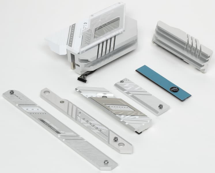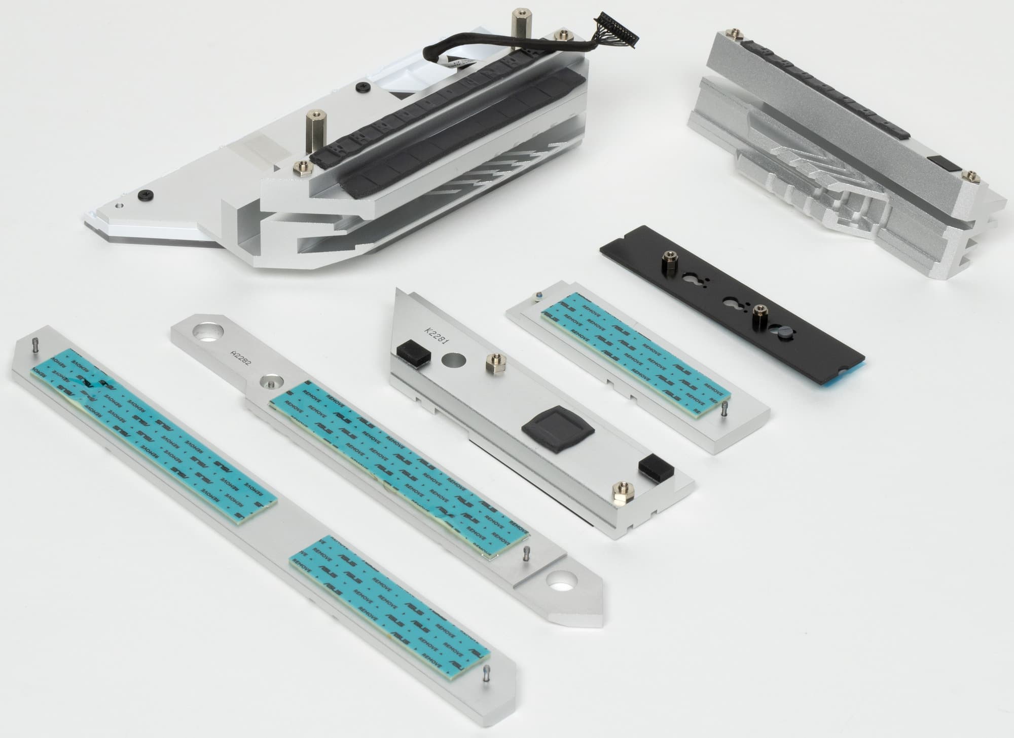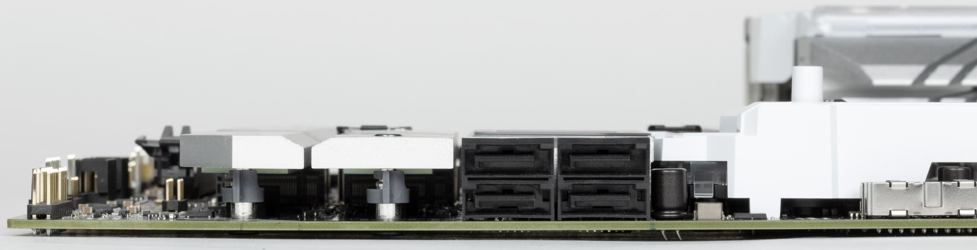 Все M.2 слоты имеют радиаторы. M2_1 и М2_2 каждый обладает своим отдельным радиатором, при этом у М2_1 термопрокладки имеются с обеих сторон накопителя. Два нижних слота M2_3 и М2_4 имеют общий радиатор.