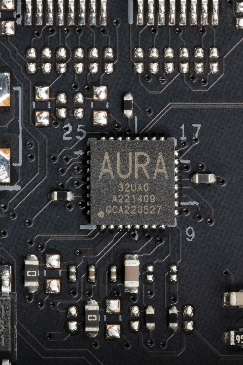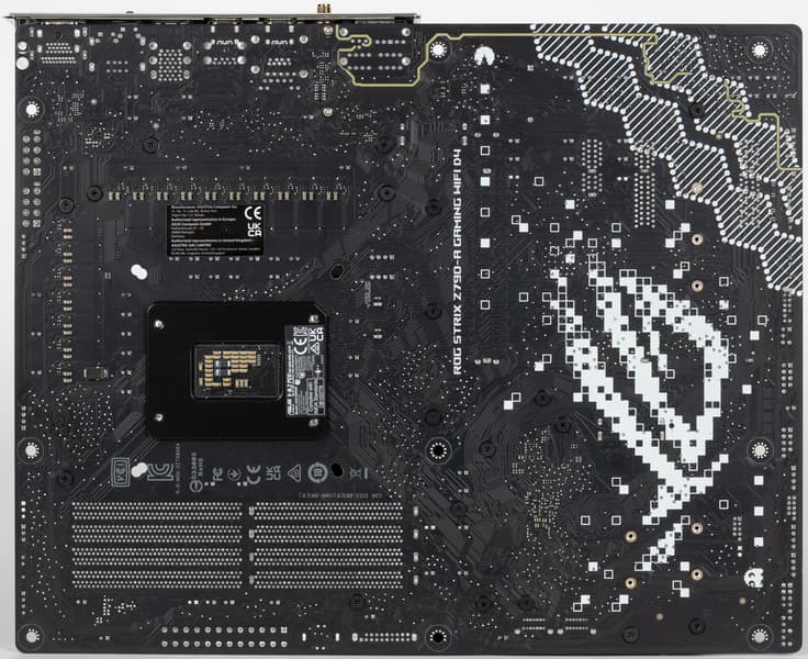 На оборотной стороне практически пусто. Текстолит обработан: во всех точках пайки острые концы срезаны. Бэкплейта нет. Но зато имеется оригинальный рисунок логотипа бренда ROG (который лишь кратковременно увидит собирающий ПК -).