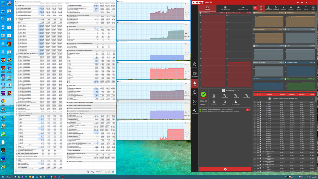 Процессор в стресс-тесте работал на 5,7/4,5 ГГц, потребляя почти 227 Вт, наша СВО прекрасно справлялась с нагревом, критических отметок не было, VRM, чипсет также не нагревались до критических величин.