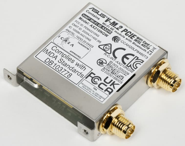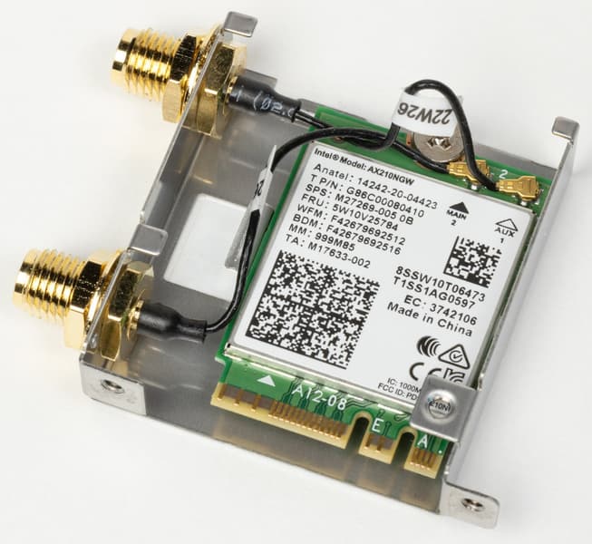 Имеется и комплексный беспроводной адаптер на контроллере Intel AX-210NGW, через который реализованы Wi-Fi 6E (802.11a/b/g/n/ac/ax) и Bluetooth 5.3. Он установлен в слот M.2 (E-key), и его разъемы для привинчивания выносных антенн выведены на заднюю панель.