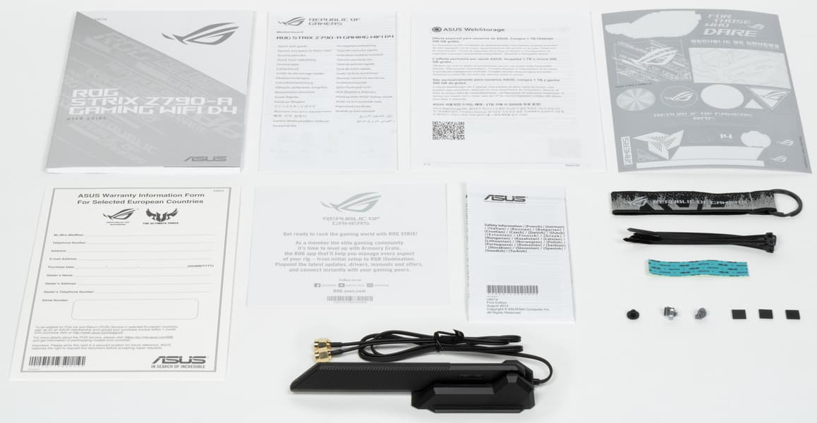 Кроме традиционных элементов типа руководства пользователя и кабелей SATA, комплект поставки включает запасные рычажки запоров для М.2 слотов, фирменную стяжку ROG, один комплект термопрокладок для М.2 слота, черные стяжки и антенну для беспроводной связи.