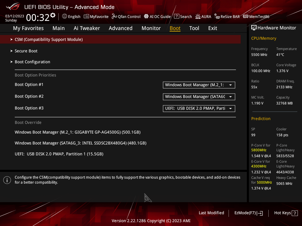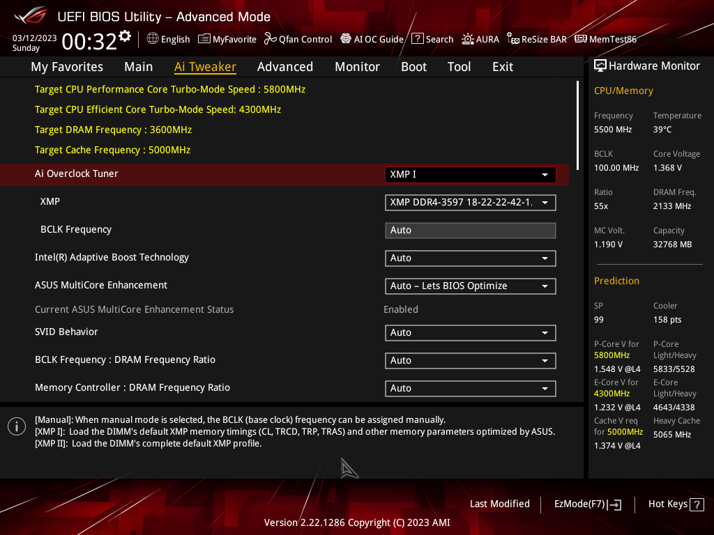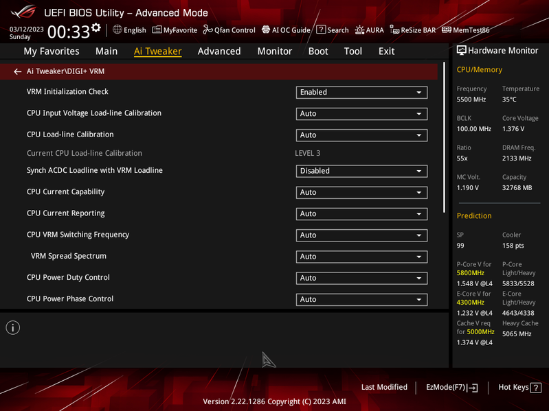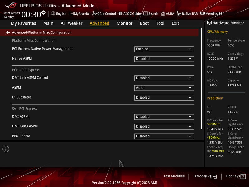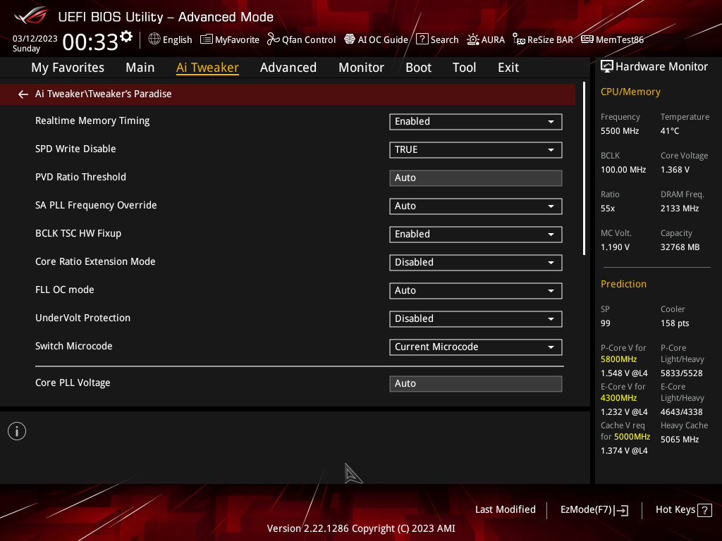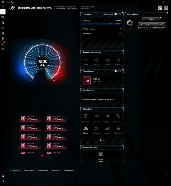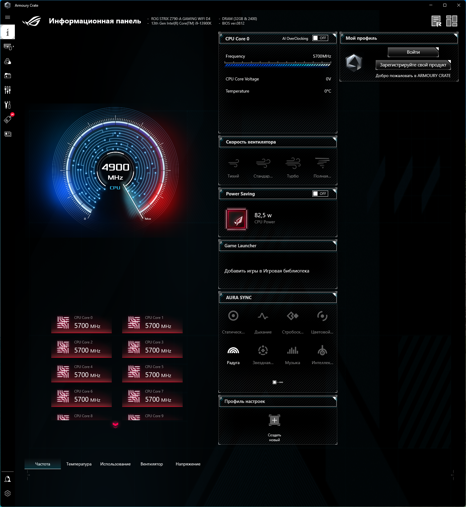 В режиме авторазгона мы получили 5.5 ГГц по всем P-ядрам, и 4.3 ГГц по всем Е-ядрам. Напомню, что Р-ядра — это обычные всем привычные ядра, имеющие по 2 потока каждый, «Р» — означает Performance, то есть производительные. «Е» — это энергоэффективные ядра, так называемые, малые ядра, у них по 1 потоку. В целом мы видим, что система по умолчанию, определив очень мощное питание матплаты, выставила очень приличный авторазгон (в целом уже очень привычные значения частот после тестов нескольких матплат на Z790).