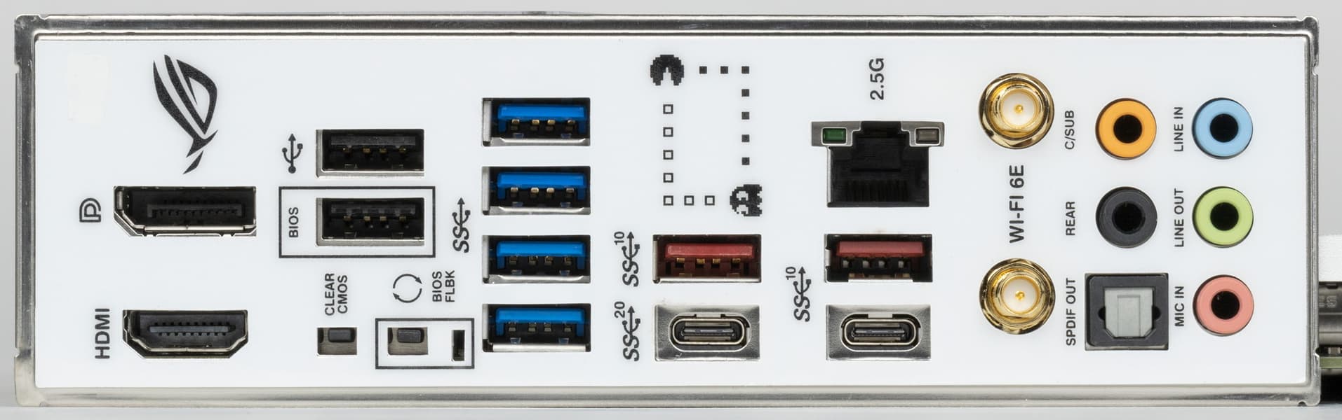 | Разъемы на задней панели | 1 × USB 3.2 Gen2x2 (Type-C) 1 × USB 3.2 Gen2 (Type-C) 2 × USB 3.2 Gen2 (Type-A) 4 × USB 3.2 Gen1 (Type-A) 2 × USB 2.0 (Type-A) 1 × RJ-45 2 антенных разъема 1 кнопка сброса CMOS 1 кнопка BIOS Flashback 5 аудиоразъемов типа миниджек 1 × S/PDIF (оптический, выход) 1 × HDMI 2.1 1 × DP 1.4 |