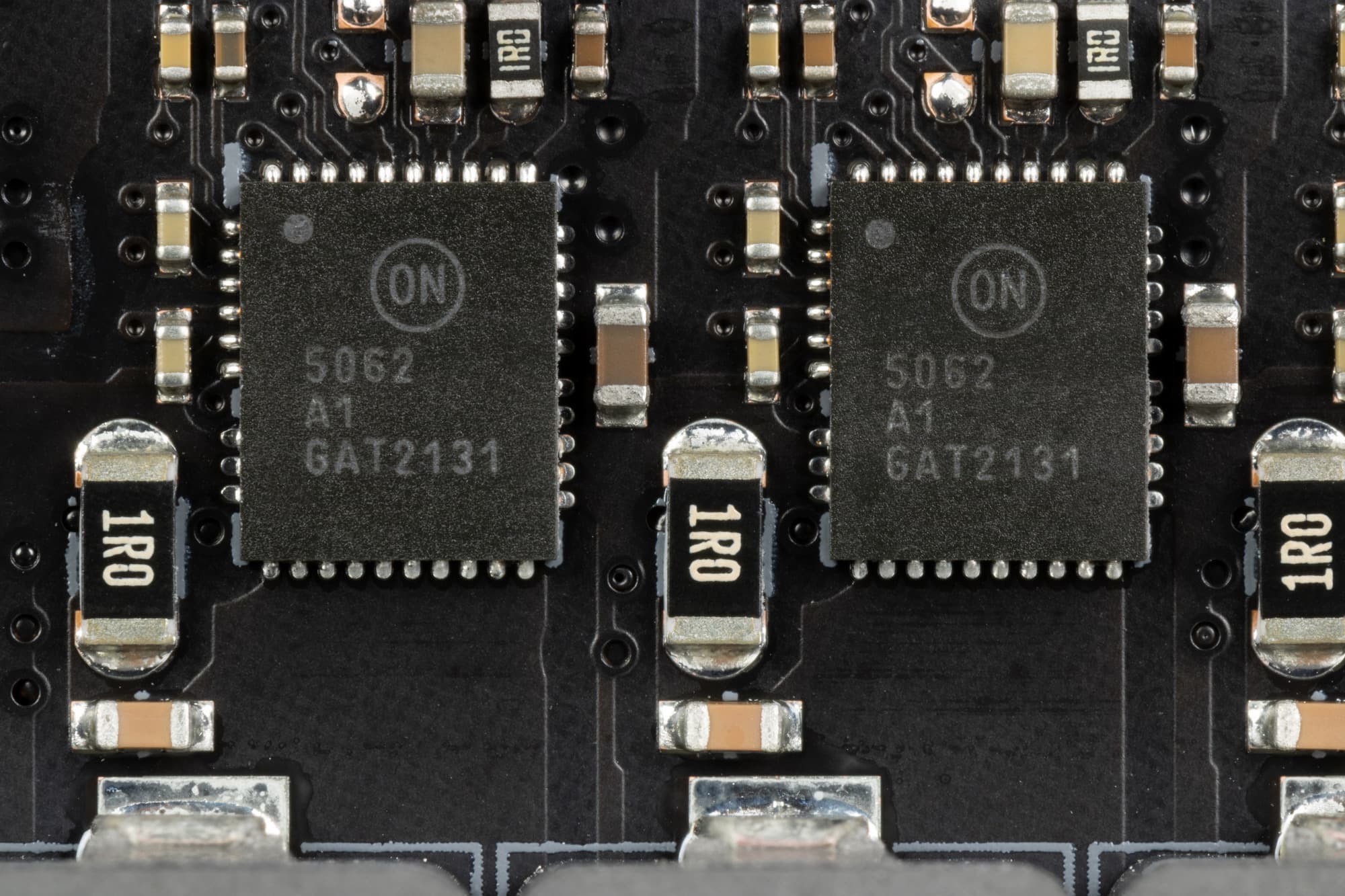 Каждый канал фазы имеет суперферритовый дроссель и FDMF5062 MOSFET от On Semi на 70 А.