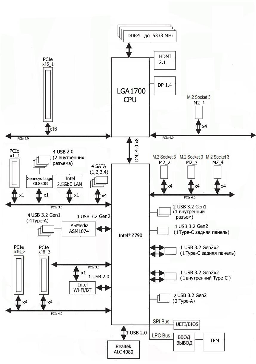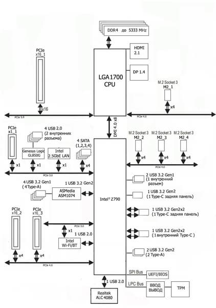 Процессоры Intel Core 13/12-го поколений (совместимые с сокетом LGA1700 и поддерживаемые Z790) имеют 20 линий ввода-вывода (16 PCIe 5.0, 4 PCIe 4.0), не имеют USB и SATA портов. При этом взаимодействие с Z790 идет по особому каналу Digital Media Interface 4.0 (DMI 4.0 x8). Все PCIe линии процессора идут на слоты расширения PCIe и порт М.2. Serial Peripheral Interface (SPI) используется для взаимодействия с системой UEFI/BIOS, а шина Low Pin Count (LPC) — для связи с устройствами ввода/вывода, не требующими высокой пропускной способности (контроллерами вентиляторов, TPM, старой периферии).