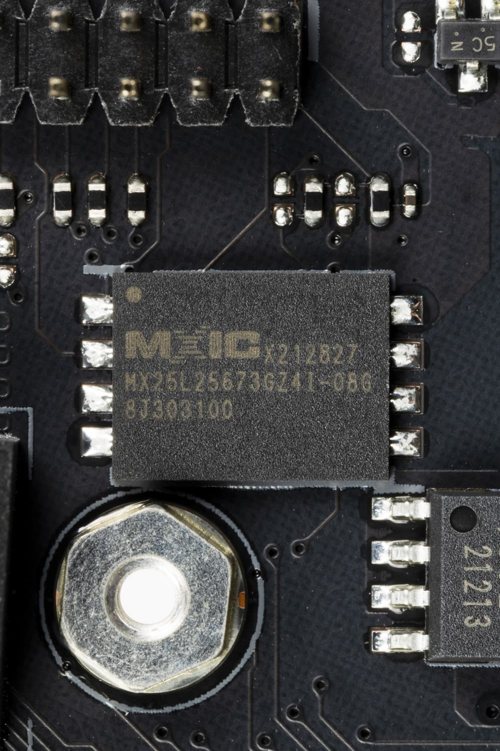 Первый («процессорный») слот PCIe x16_1 имеет металлическое армирование из нержавеющей стали, которое увеличивает надежность (что может быть важным в случае довольно частой смены видеокарт, но что более важно: такой слот легче выдержит нагрузку на изгиб в случае установки очень тяжелой видеокарты топового уровня. Кроме того, такая защита предохраняет от электромагнитных помех.