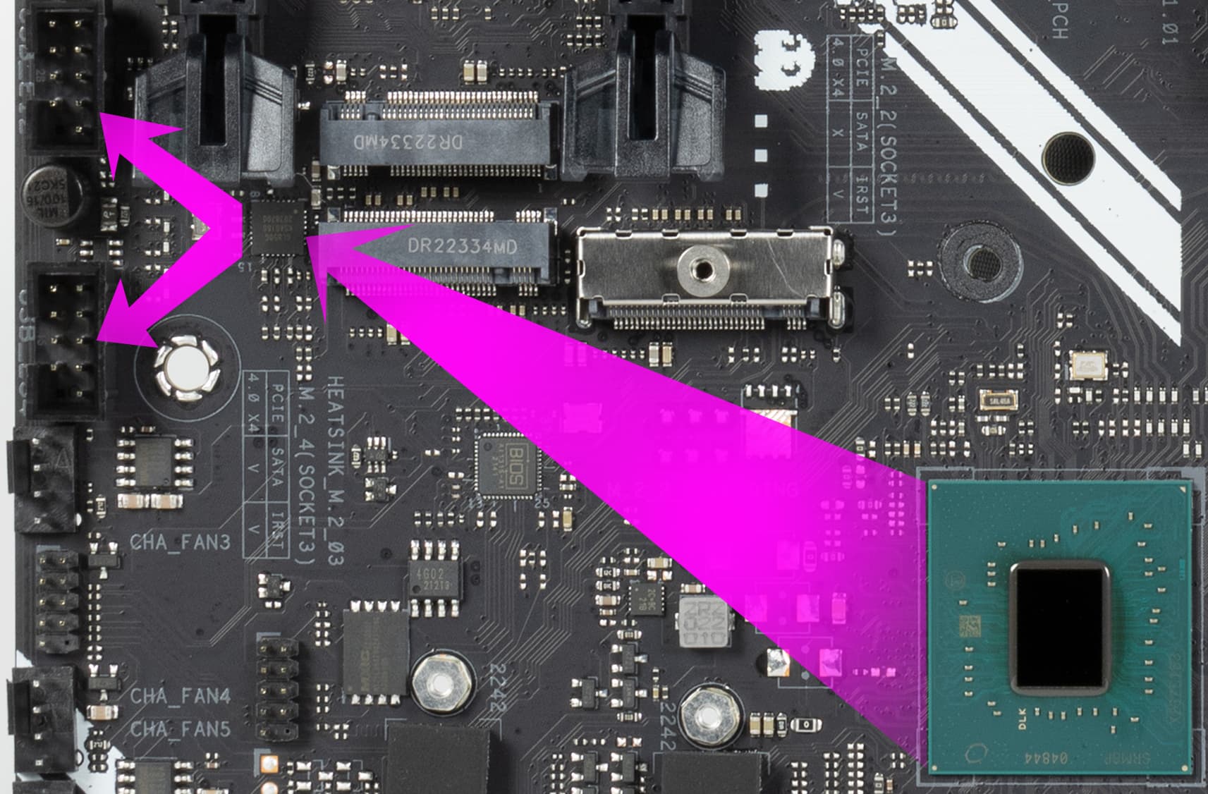 В свою очередь процессоры 12го и 13го поколений имеют поддержку PCIe 5.0 в виде 16 линий (расходуемые на слоты PCIe x16/М.2), плюс 4 линии PCIe 4.0, жестко идущие на один из М.2 слотов, получающий данные напрямую от процессора.