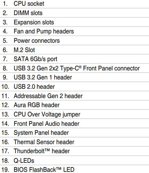 | Прочие внутренние элементы | 24-контактный разъем питания ATX 2 8-контактных разъема питания EPS12V 1 разъем для подключения порта USB 3.2 Gen2 Type-C 1 разъем для подключения 2 портов USB 3.2 Gen1 2 разъема для подключения 4 портов USB 2.0 8 разъемов для подключения 4-контактных вентиляторов и помп ЖСО 1 разъем для подключения неадресуемой RGB-ленты 3 разъема для подключения адресуемой ARGB-ленты 1 разъем аудио для передней панели корпуса 1 разъем Thunderbolt 1 разъем для термодатчика 1 переключатель для возможности повышения вольтажа на процессоре CPU_OV 2 разъема для подключения управления с передней панели корпуса |