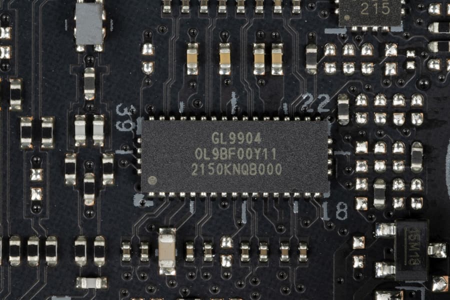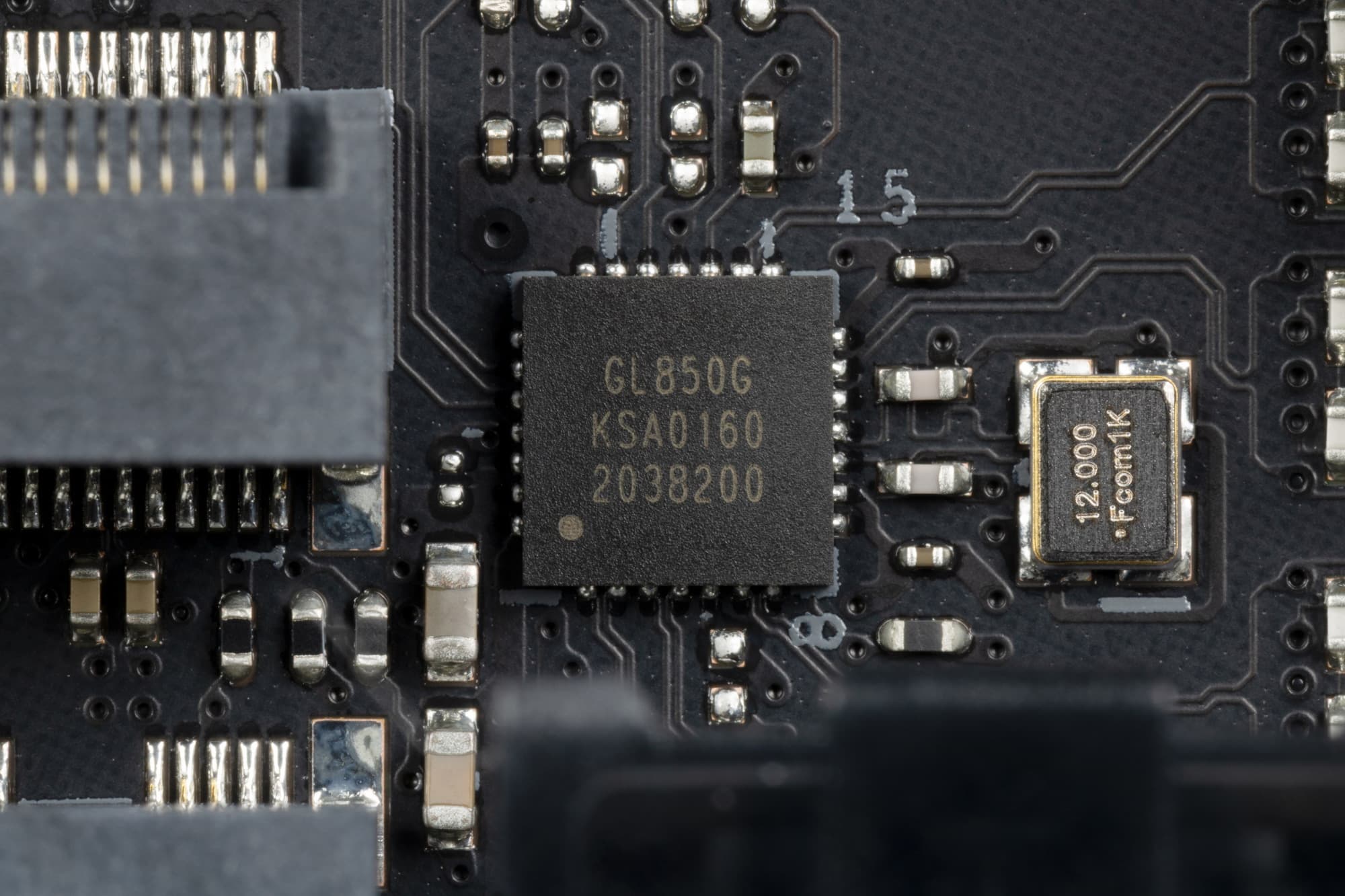- 6 портов USB 2.0/1.1: 4 реализованы через контроллер Genesys Logic GL850G (на него потрачена 1 линия PCIe 3.0 от Z790) и представлены двумя внутренними разъемами (каждый на 2 порта); еще 2 реализованы через Z790 и представлены на задней панели портами Type-A (черного цвета).