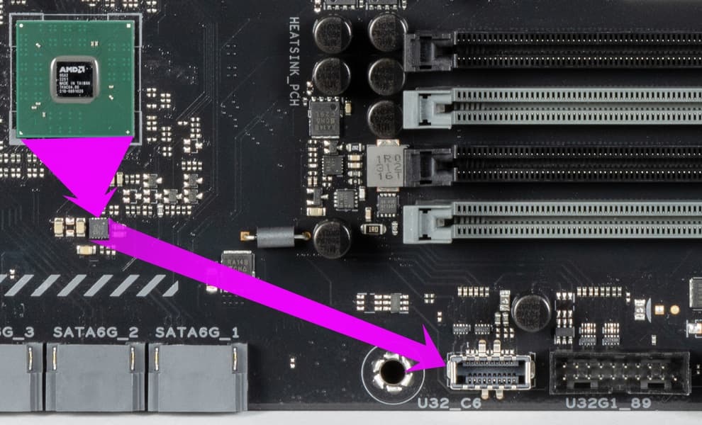 Итак, кроме USB-портов, к которым мы подойдем позже, чипсет A620 обладает 8 PCIe линиями. Считаем, сколько линий уходит на поддержку (связь) с тем или иным элементом: