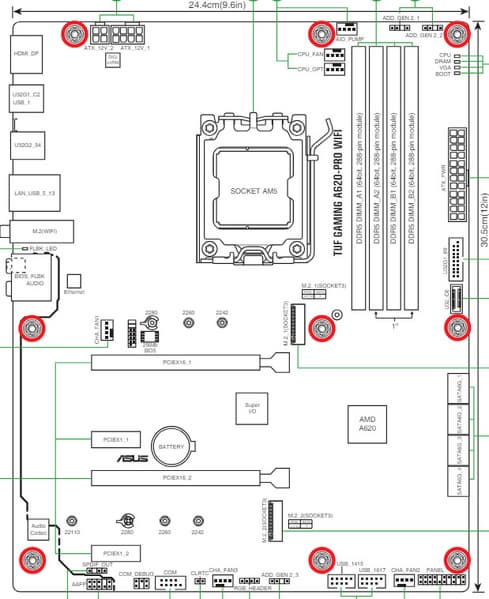 Форм-фактор ATX имеет размеры до 305×244 мм, а E-ATX — до 305×330 мм. Материнская плата Asus TUF Gaming A620-Pro WiFi имеет размеры 305×244 мм, поэтому выполнена в форм-факторе ATX, и на ней имеются 9 монтажных отверстий для установки в корпус.