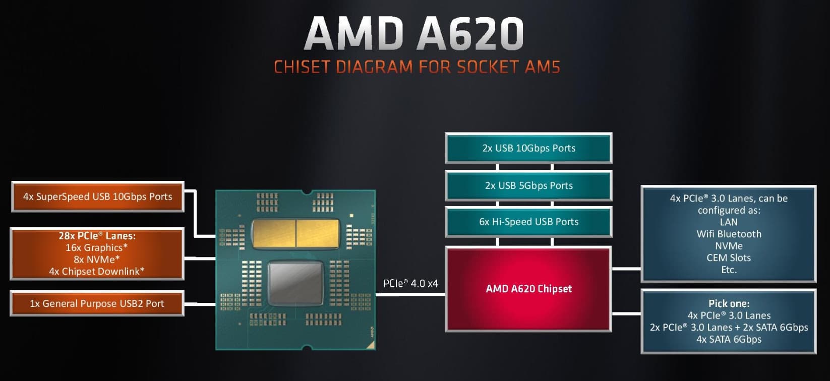 - 4 линии из них (в случае чипсета A620 пониженные до версии 3.0) идут на взаимодействие с чипсетом,