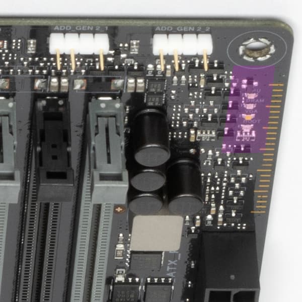 У нее 13 портов USB разных видов (включая 2 USB 3.2 Gen2 и 4 USB 3.2 Gen1), 2 слота PCIe х16 (один из которых подключен к процессору 16 линиями PCIe 4.0, а второй подключен к чипсету и работает в режиме х2), 2 слота PCIe x1 (при их использовании слот PCIe x16_2 отключается), 2 слота M.2 (подключены напрямую к процессору линиями PCIe 4.0), 4 порта SATA и 6 разъемов для вентиляторов. Также стоит отметить наличие двух сетевых контроллеров: проводного (2,5-гигабитного) и беспроводного (Wi-Fi 6).