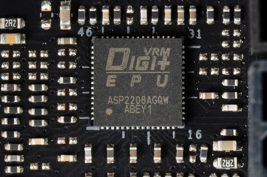 Управляет фазами VCore и VDD_MISC фирменный цифровой контроллер Digi ASP 2208 от Asus (какой в реальности контроллер скрыт под этой маркировкой — мы не знаем). Есть некоторые сведения, что он способен напрямую работать максимум с 16 фазами питания, но точной информации нет.