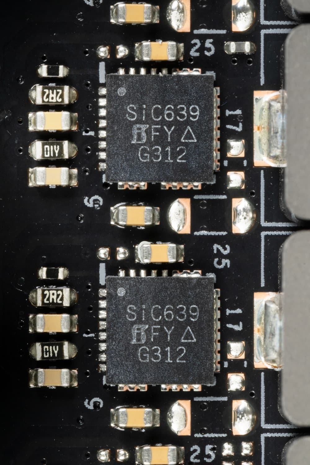 Каждая фаза имеет по транзисторной сборке SiC639 от Vishay (до 50А).