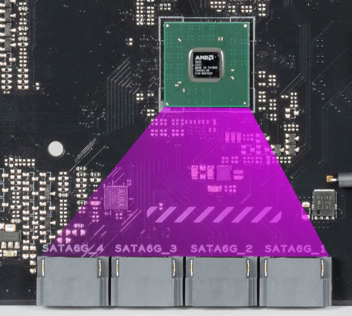 Всего у платы 4 разъема Serial ATA 6 Гбит/с + 2 слота для накопителей в форм-факторе M.2. 4 порта SATA 1,2,3,4 реализованы через чипсет A620 и поддерживают создание RAID.