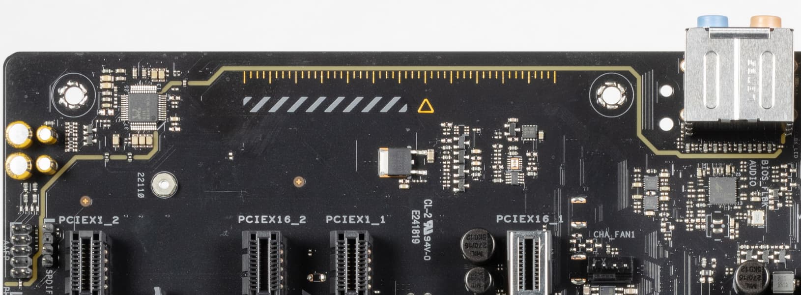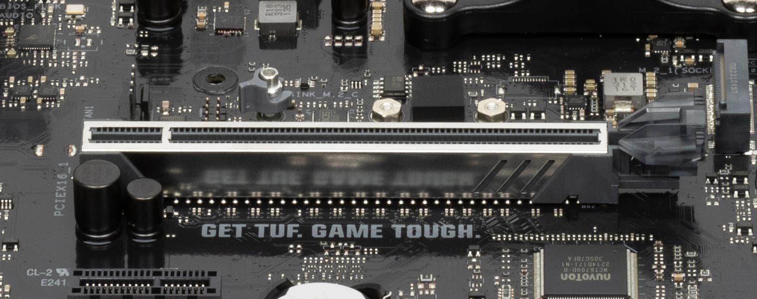 Первый слот PCIe x16_1 (для видеокарт) имеет металлическое армирование из нержавеющей стали, которое увеличивает надежность (что может быть важным в случае довольно частой смены видеокарт, но что более важно: такой слот легче выдержит нагрузку на изгиб в случае установки очень тяжелой видеокарты топового уровня. Кроме того, такая защита предохраняет слоты от электромагнитных помех.