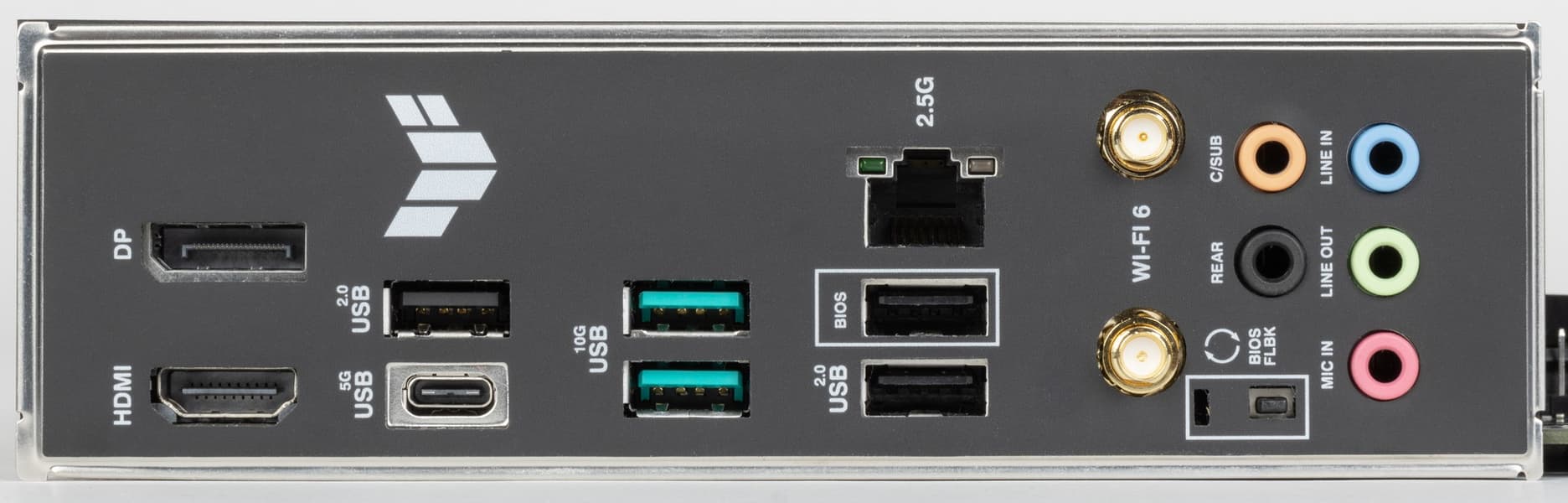 | Разъемы на задней панели | 1 × USB 3.2 Gen2 (Type-C) 2 × USB 3.2 Gen2 (Type-A) 3 × USB 2.0 (Type-A) 1 × RJ-45 2 антенных разъема 1 кнопка BIOS Flashback 5 аудиоразъемов типа миниджек 1 × HDMI 2.0b 1 × DP 1.4a |