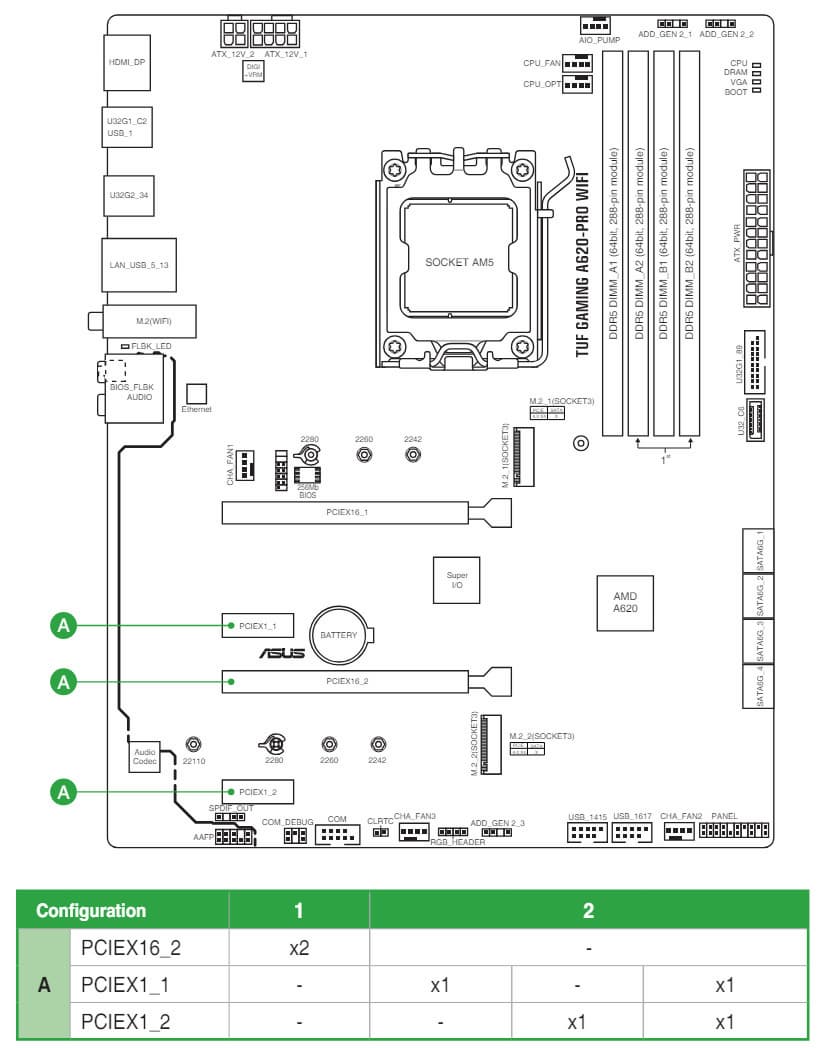 Второй «длинный» слот PCIe x16_2 поддерживает всего 2 линии PCIe 3.0, получая данные от A620, при это он делит ресурсы со слотами PCIe x1_1/2 (как показано на схеме выше), то есть они работают по взаимоисключающей схеме.