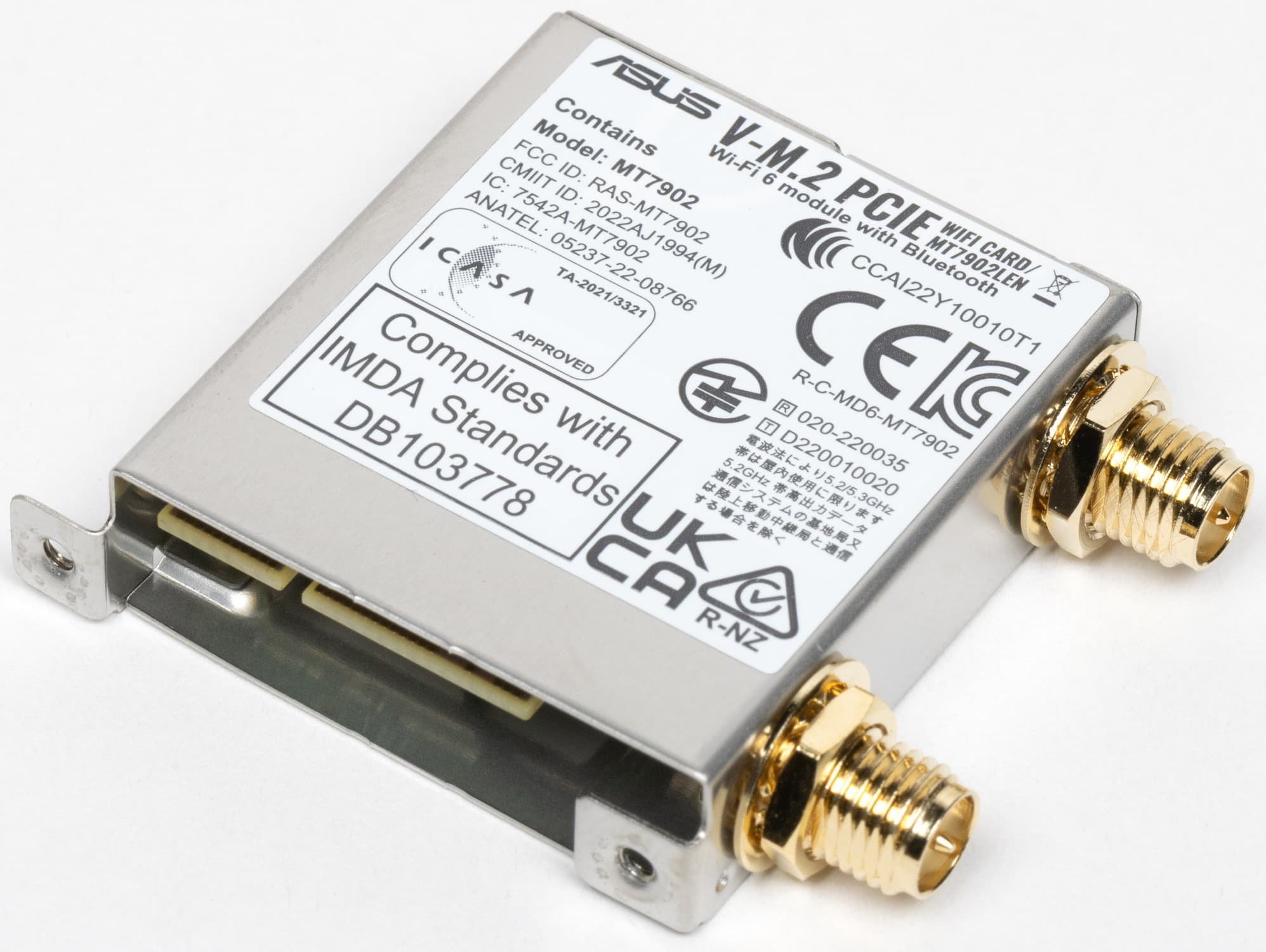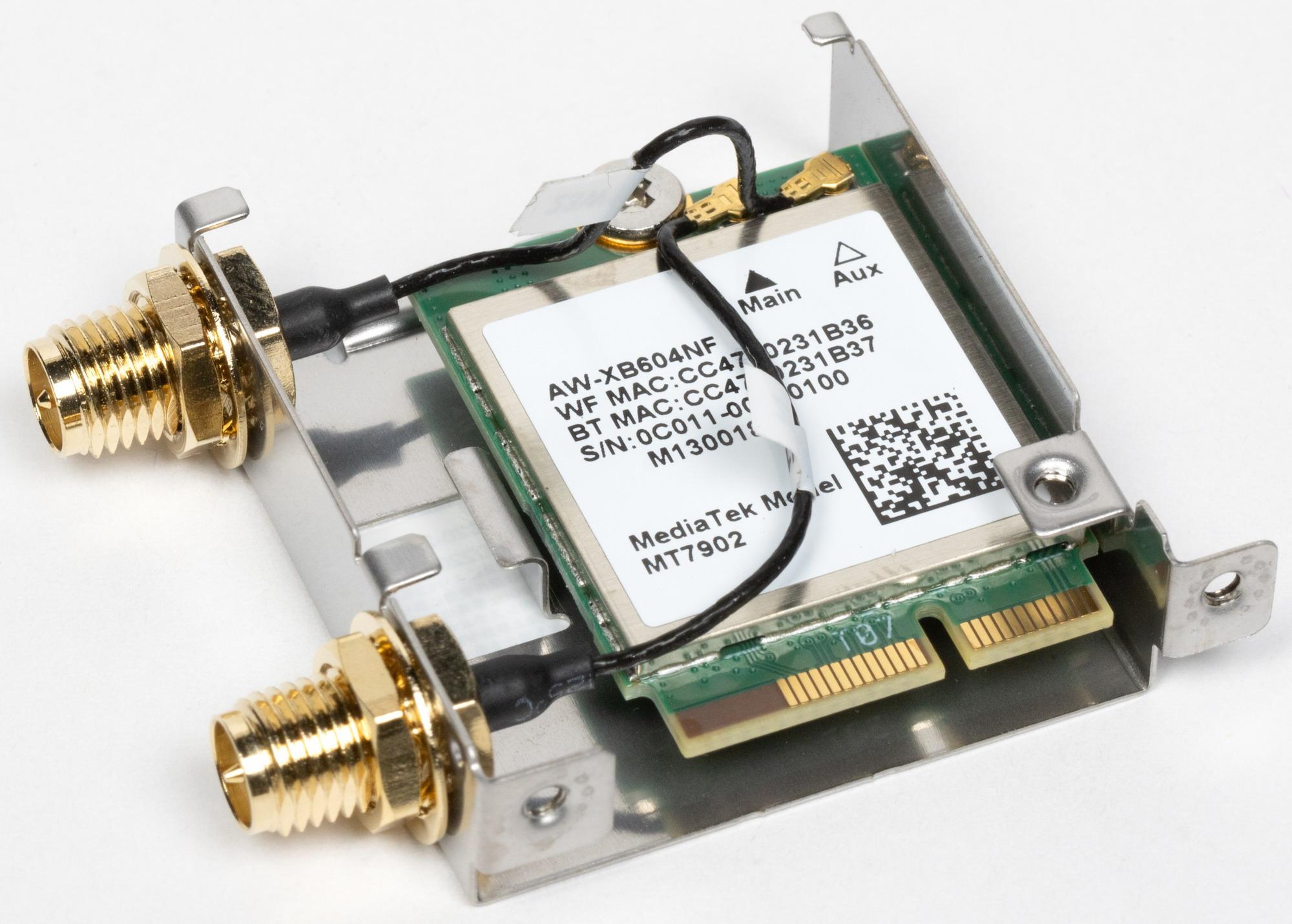 Имеется и комплексный беспроводной адаптер на контроллере MediaTek MT7902, через который реализованы Wi-Fi 6 (802.11a/b/g/n/ac/ax) и Bluetooth 5.3. Он установлен в слот M.2 (E-key), и его разъемы для привинчивания выносных антенн выведены на заднюю панель.