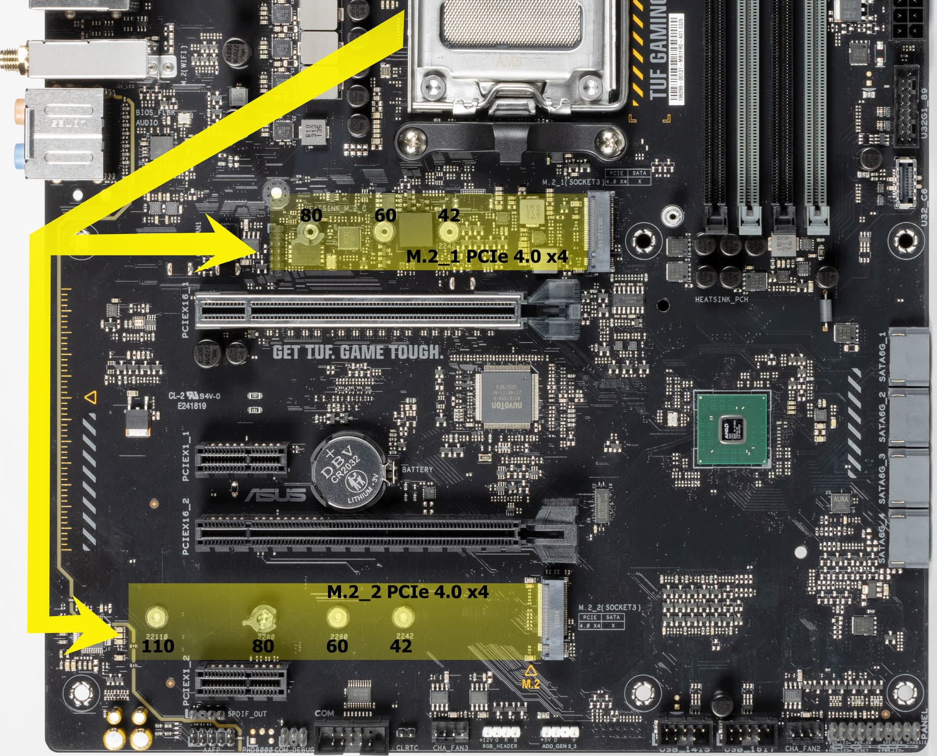 Оба слота получают данные от CPU (PCIe 4.0). Все слоты работают с модулями только с PCIe интерфейсом.