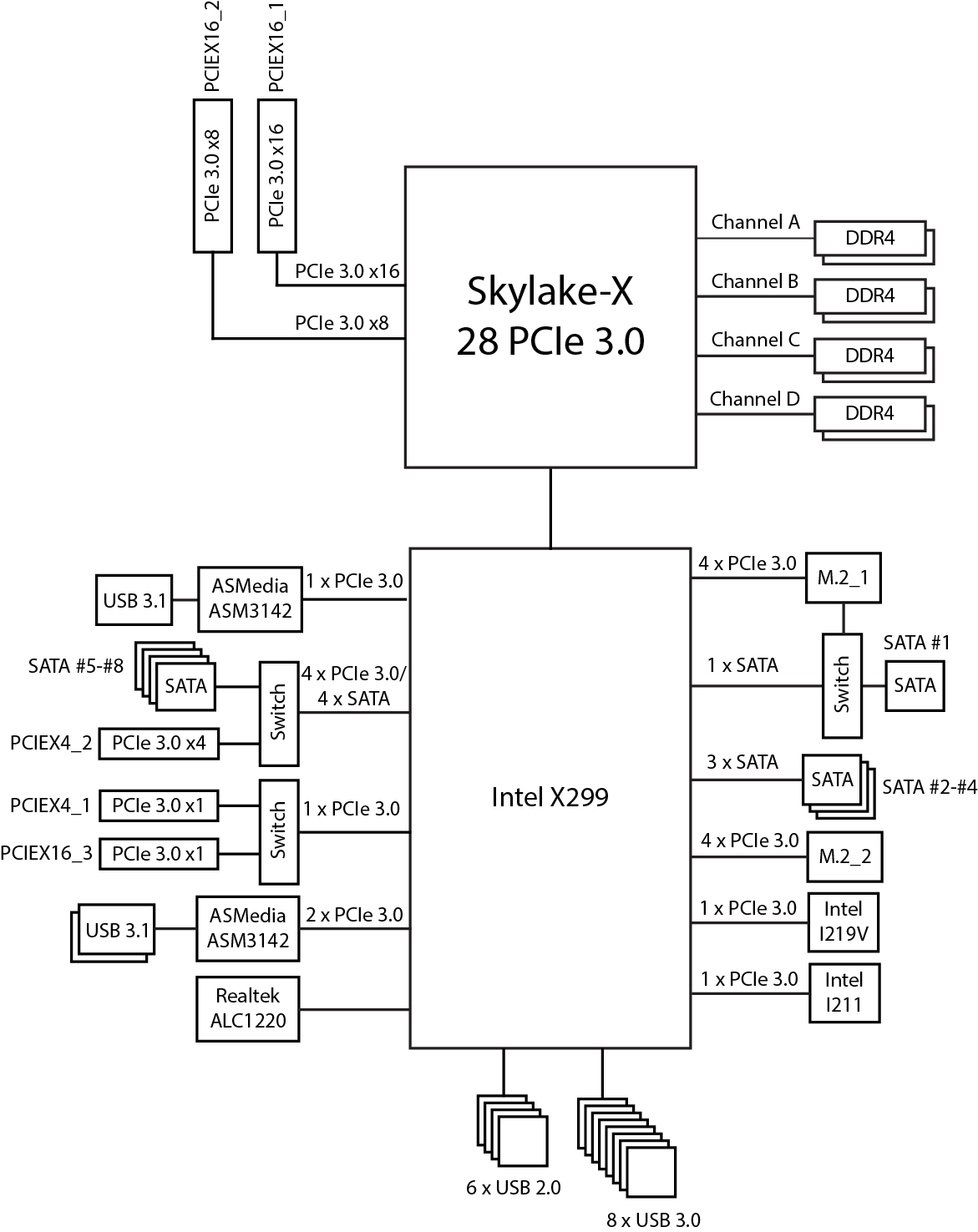 Блок-схема платы Asus TUF X299 Mark 1 в варианте процессора с 28 линиями PCIe 3.0 показана на рисунке.