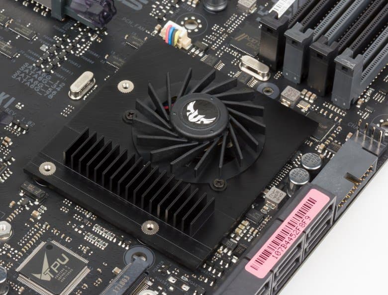Система охлаждения платы Asus TUF X299 Mark 1 состоит из трех радиаторов. Один радиатор предназначен для отвода тепла от элементов регулятора напряжения питания процессора.