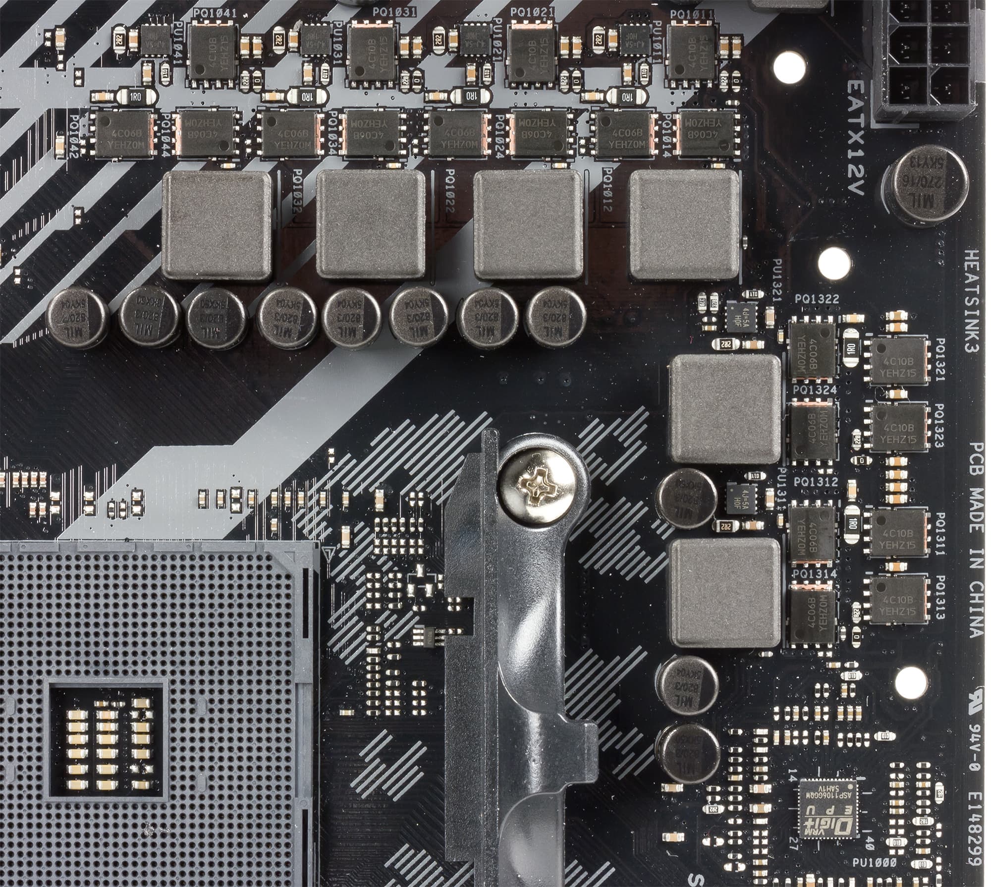 Как и вообще большинство плат уровнем хоть немного выше среднего, эта снабжена 24-контактным и 8-контактным разъемами для подключения блока питания. Причем и сама организация системы питания похожа на топовые платы Asus для платформ АМ4 или LGA1151 используемым контроллером, но вот всего шесть фаз набраны не интегрированными сборками, а на обычных полевиках.