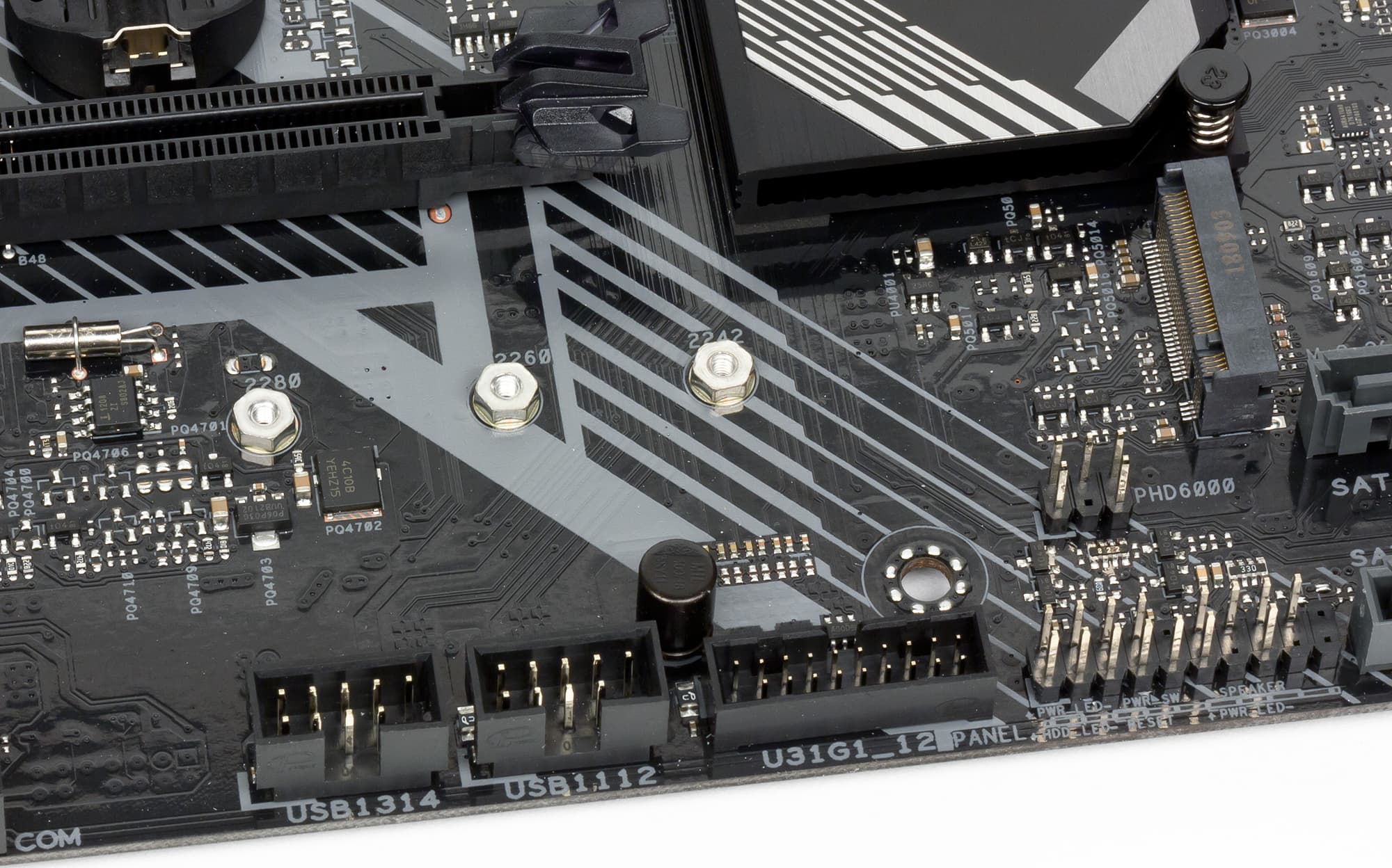 Для подключения накопителей или оптических приводов на плате предусмотрено шесть портов SATA600, реализованных на базе интегрированного в чипсет AMD X470 контроллера. Последний поддерживает до восьми портов, но такую функциональность компания приберегла для топовых плат. Зато к расположению этой шестерки инженеры компании подошли творчески, разнеся их по разным областям платы, что вполне может облегчить их использование в корпусах большого размера.