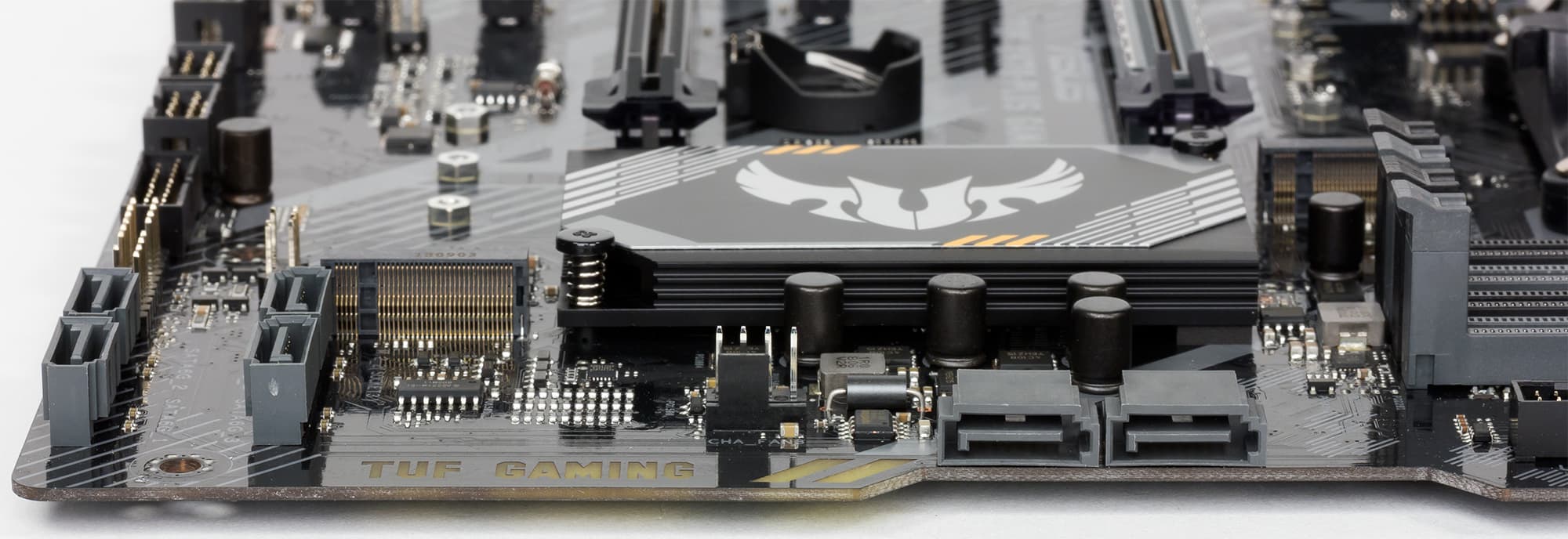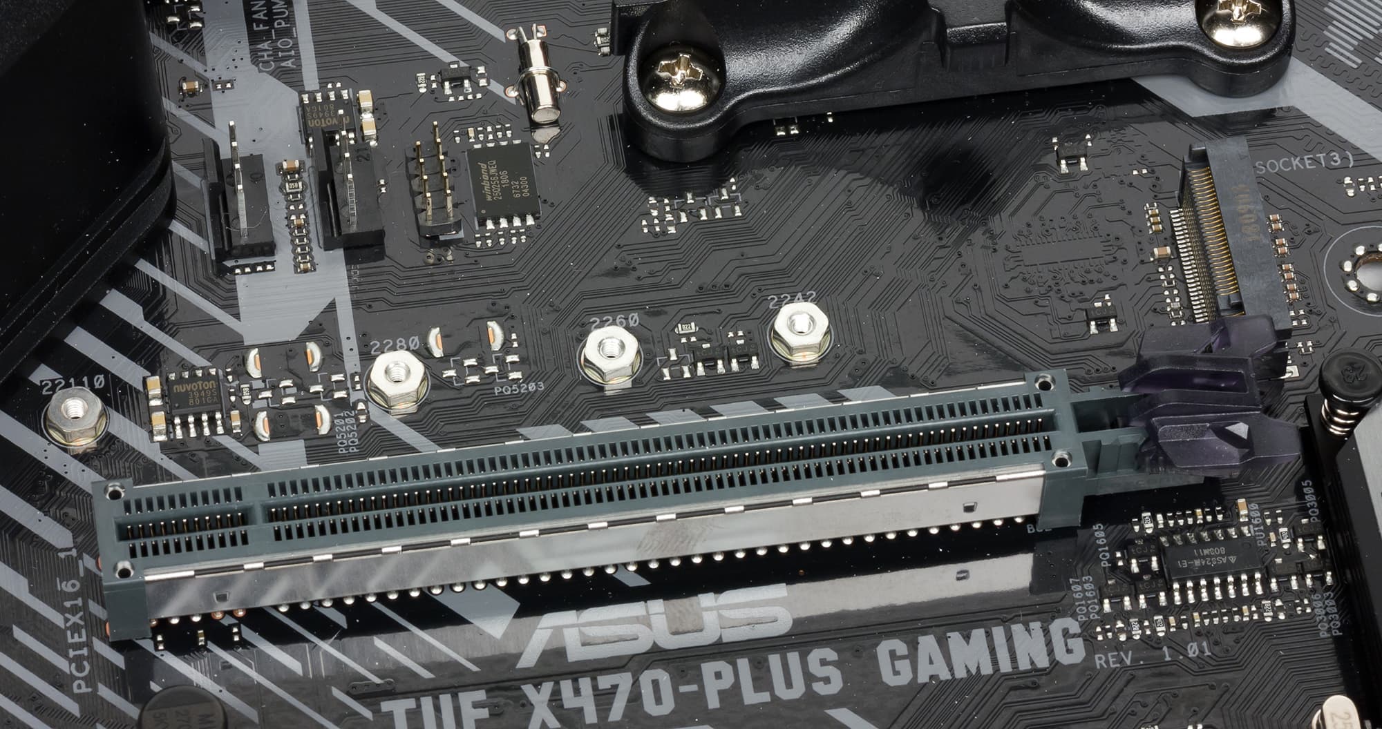 Для установки видеокарт, плат расширения и накопителей на плате имеется два слота с форм-фактором PCI Express x16, три слота PCI Express 2.0 x1, а также два разъема M.2. Первый из M.2 предназначен для установки твердотельных накопителей типоразмера 2242/2260/2280/22110, второй ограничивает длину плат величиной 80 мм (т. е. не более, чем 2280), и оба поддерживают устройства с интерфейсом SATA или PCIe. «Первичный» слот вопросов не вызывает: он использует встроенный в процессор контроллер PCIe 3.0 x4, предназначенный как раз специально для NVMe-накопителей. Второй же слот официально подключен к чипсету, но работает в режиме PCIe 3.0 x2. Хотя чипсет X470 поддерживает только PCIe 2.0, особых противоречий в этом нет: как мы помним, еще в предыдущей линейке чипсетов были предусмотрены две линии PCIe для использования в составе разъемов SATA Express. SATA Express почил в бозе, так и не став востребованным, но их удалось задействовать для других целей. В принципе, схема уже нам знакомая: точно такая же используется в ROG Strix X470-F Gaming. Отличием же этой платы от более дорогих можно считать отсутствие каких-либо радиаторов для слотов M.2: задачу охлаждения установленных в них накопителей придется решать самостоятельно.