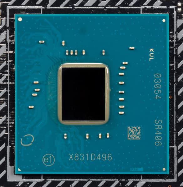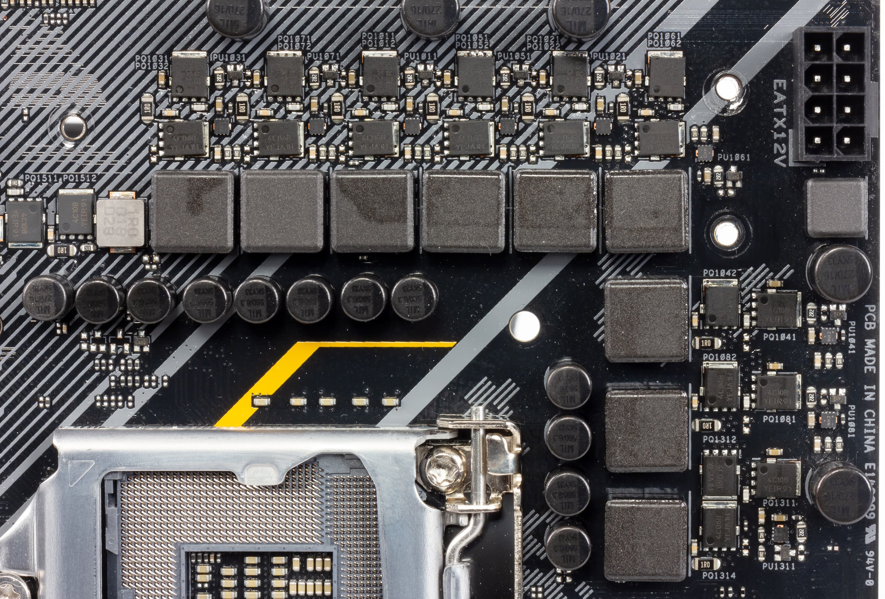 Система питания существенно отличается от тех, что мы ранее видели на топовых материнских платах. Если там могли видеть 12-16 фаз, то тут очевидна 9-фазная схема (8 — на ядро, 1 — на интегрированное видео iGPU).