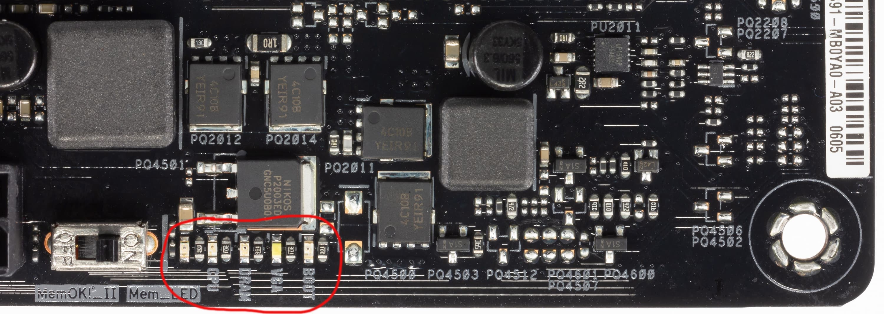 Никаких удвоителей на материнской плате нет, поэтому фазы сгруппированы парами, подключены параллельно к ШИМ-контроллеру. И только фаза, идущая на питание графического ядра CPU, идет отдельно — к ней подключено два MOSFET On Semiconductor NTMFS4C06B. Остальные фазы имеют по два мосфета NTMFS4CC10B+NTMFS4C06B.
