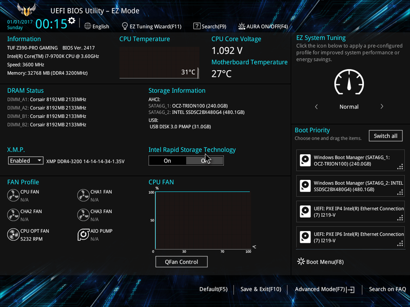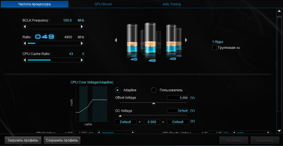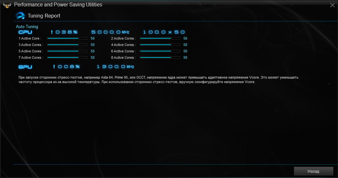 Плату сильно мучить разгоном я не стал (нет смысла), использовал штатные возможности ПО через AI- Suite, запустив Auto-Tuning. И получил 4,7 ГГц по всем ядрам.