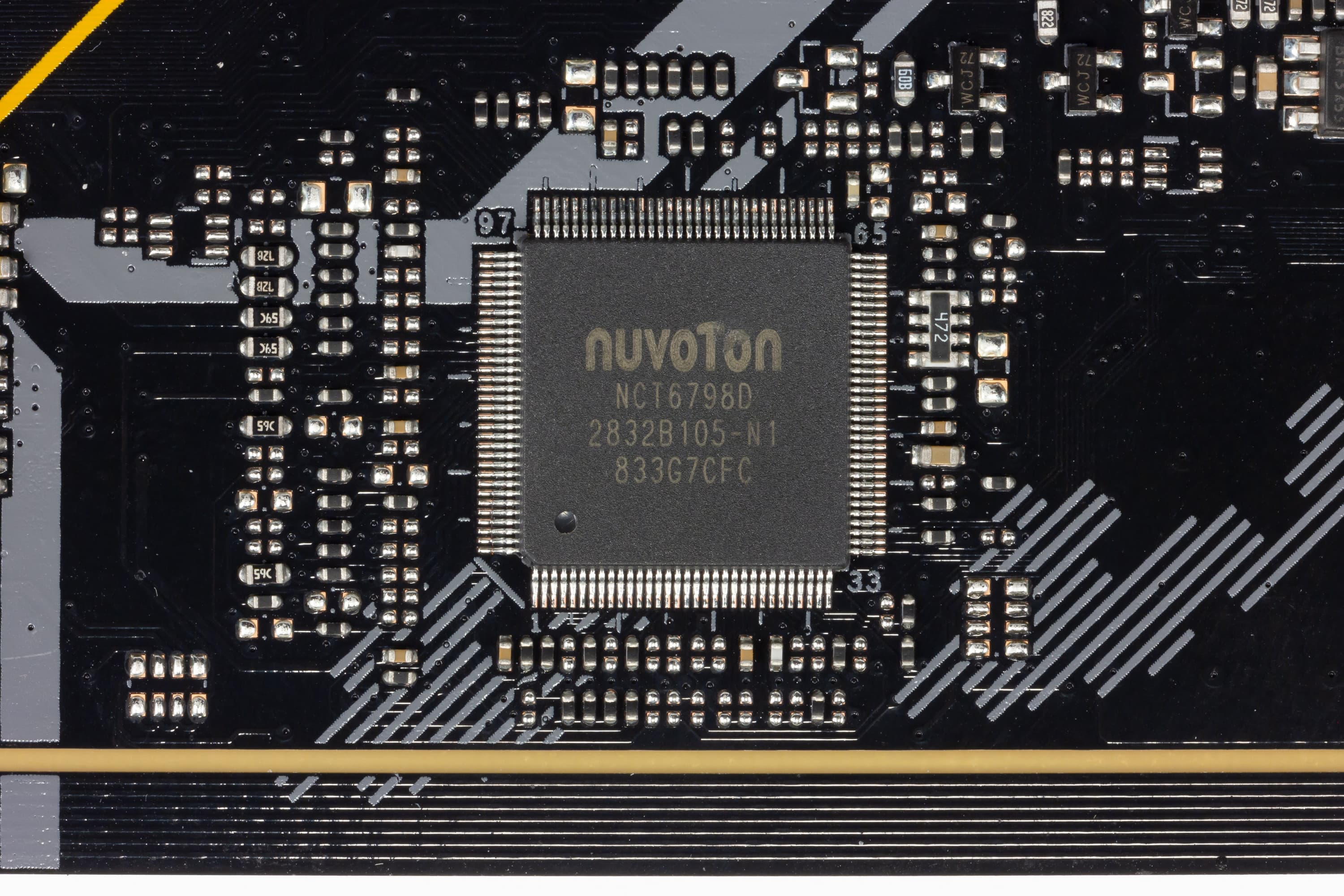 Мониторингом, а также Multi I/O (например, обеспечением работы порта PS/2) занимается контроллер Nuvoton NCT6798D.