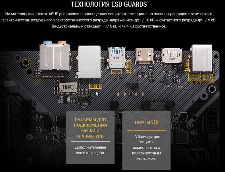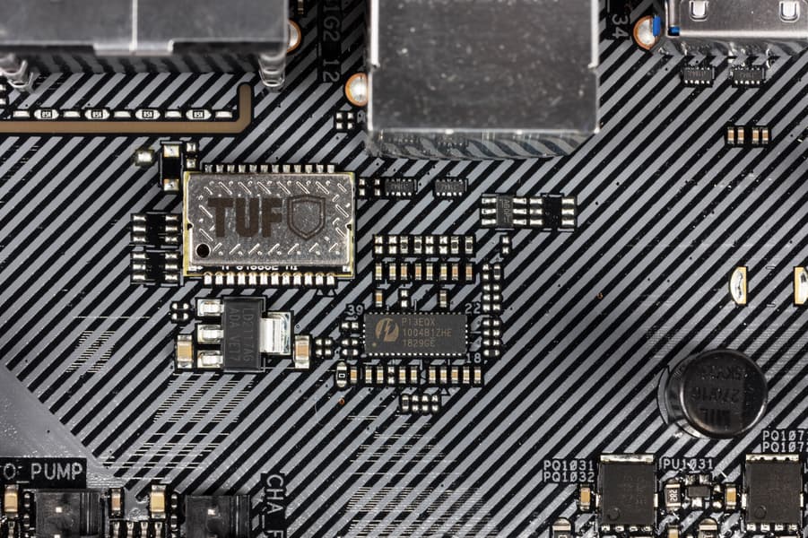 Беспроводных адаптеров нет. На одном из снимков выше виден некий чип, закрытый логотипом TUF — это фирменная технология Asus — LANGuard (технология защиты сетевых соединений), которая в случае с материнками TUF получила соответствующее название. Проверить реальную пользу этой технологии не удалось, отзывы в Сети о ней — противоречивые.