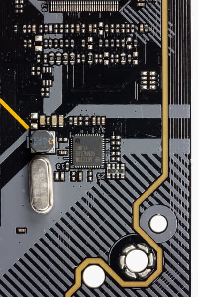 На всех современных материнских платах высокого уровня звуком заведует аудиокодек Realtek ALC1220 (с разными модификациями), на платах уровнем ниже ставят и аудиопроцессор по-проще, как в данном случае: Realtek ALC1200, однако он также обеспечивает вывод звука по схемам до 7.1. Сам чип закрыт металлическим колпачком, защищающим его от помех.