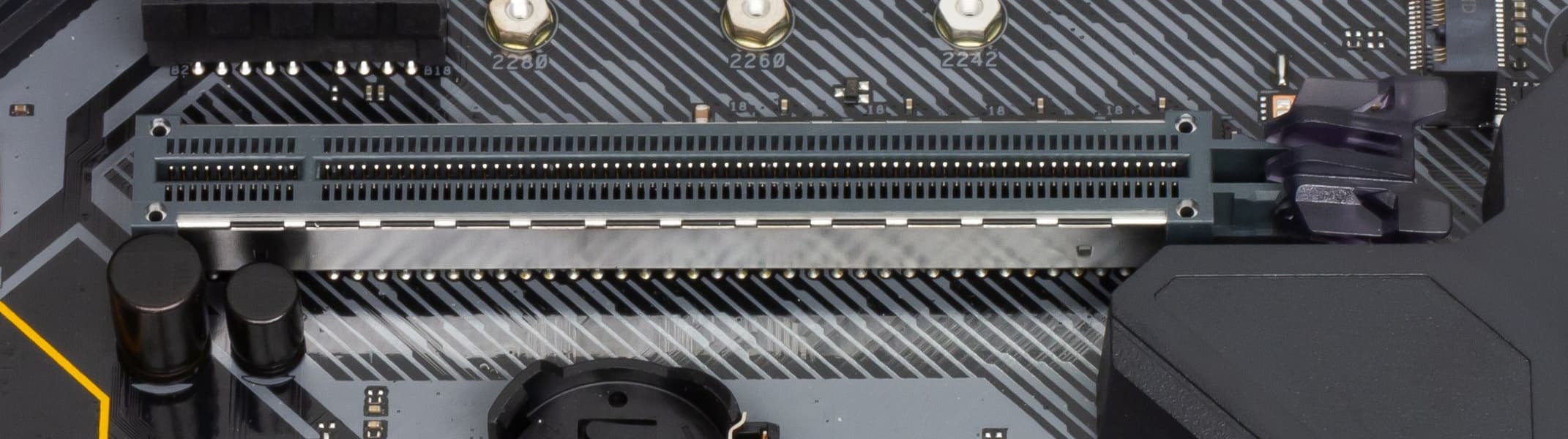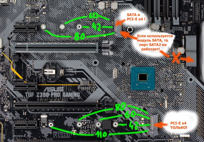Самые длинные M.2-модули (22110) можно устанавливать в нижний слот М2_2, однако только с интерфейсом PCI-E. А также следует помнить, что из-за нехватки системных ресурсов у Z390 (вот здесь AMD X570 начисто выигрывает!) практически на всех материнках приходится наблюдать условие: «или-или». Так и в нашем случае: при установке в М2_1 (верхний) модуля с интерфейсом SATA порт SATA2 вырубится. То есть читатели поняли, что, например, если мы подключили жесткий диск или SSD к порту SATA2, то в М2_1 слот вставлять накопители c интерфейсом SATA бесполезно.