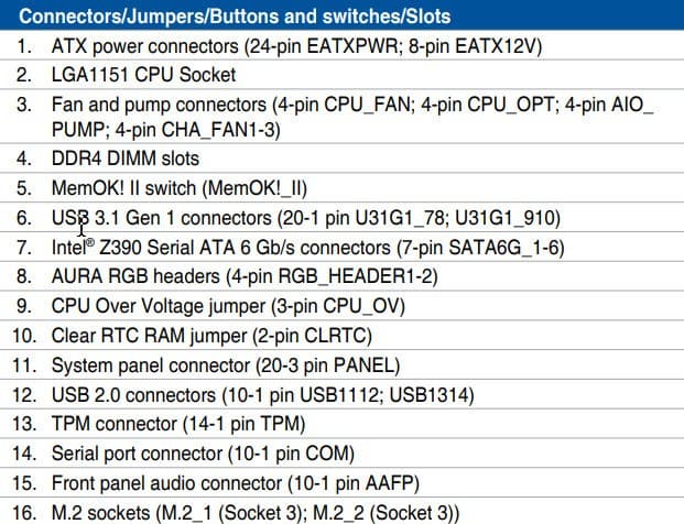 | USB-порты | 2 × USB 3.1 Gen2: Type-A (голубые)(Z390) 8 × USB 3.1 Gen1: 4 порта Type-A (синие) на задней панели; 2 внутренних разъема, каждый на 2 порта (Z390) 4 × USB 2.0: 2 внутренних разъема, каждый на 2 порта (Z390) |