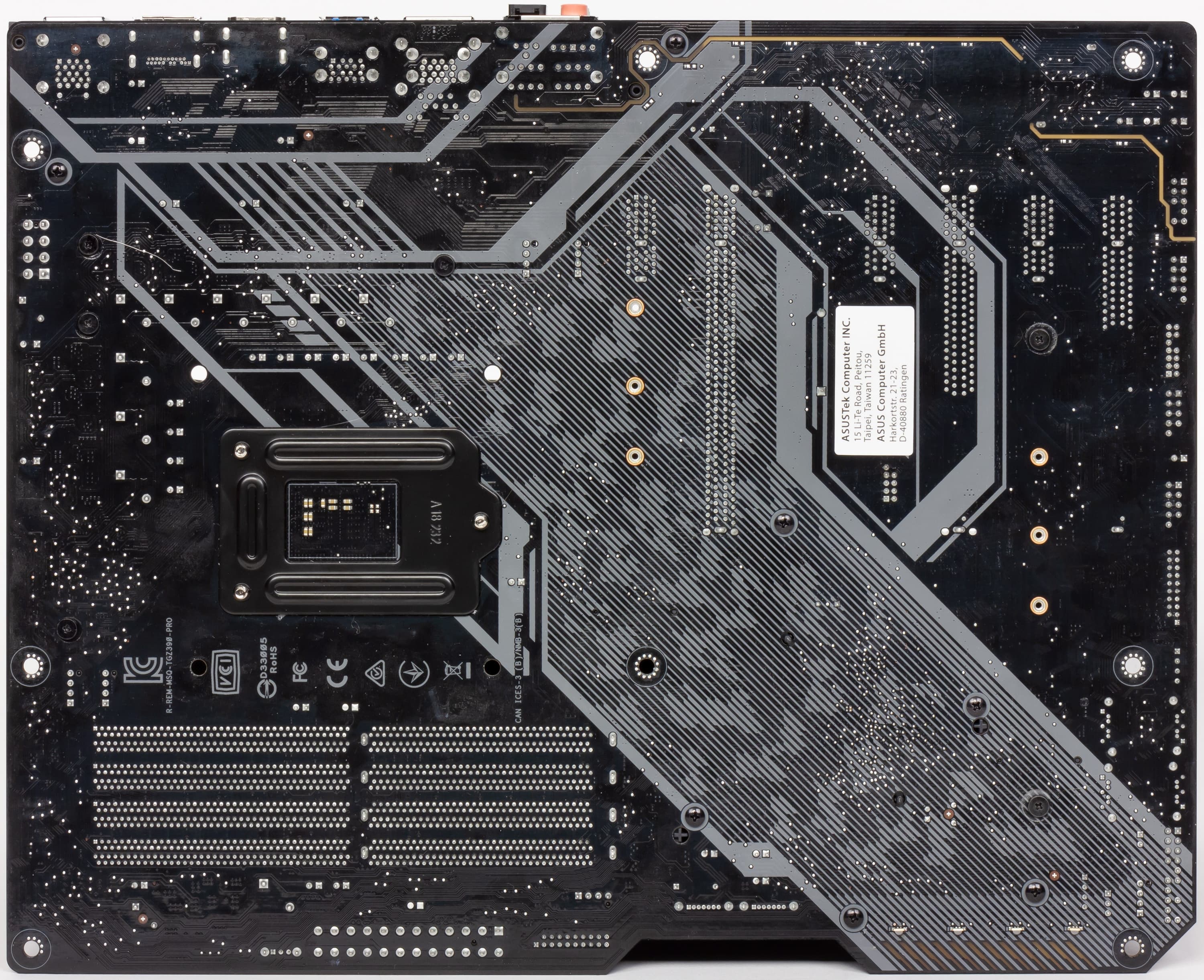 Материнская плата Asus TUF Z390-Pro Gaming выполнена в форм-факторе ATX, имеет размеры 305×244 мм и 8 (восемь!) монтажных отверстий для установки в корпус. Девятое отверстие не смогло разместиться, ибо случился там вырез в PCB. По идее вырез нужен для подключения SATA-кабелей, у которых разъемы под прямым углом к самим кабелям (к тому же около этого выреза — всего два разъема SATA), чтобы кабели сразу же уходили через вырез в корпусе за материнскую плату. Однако обычно в корпусах все же соответствующий вырез находится ниже. И вообще, есть ощущение, что ради дизайна и подсветки единственного кусочка платы между двумя вырезами, все это и было затеяно.