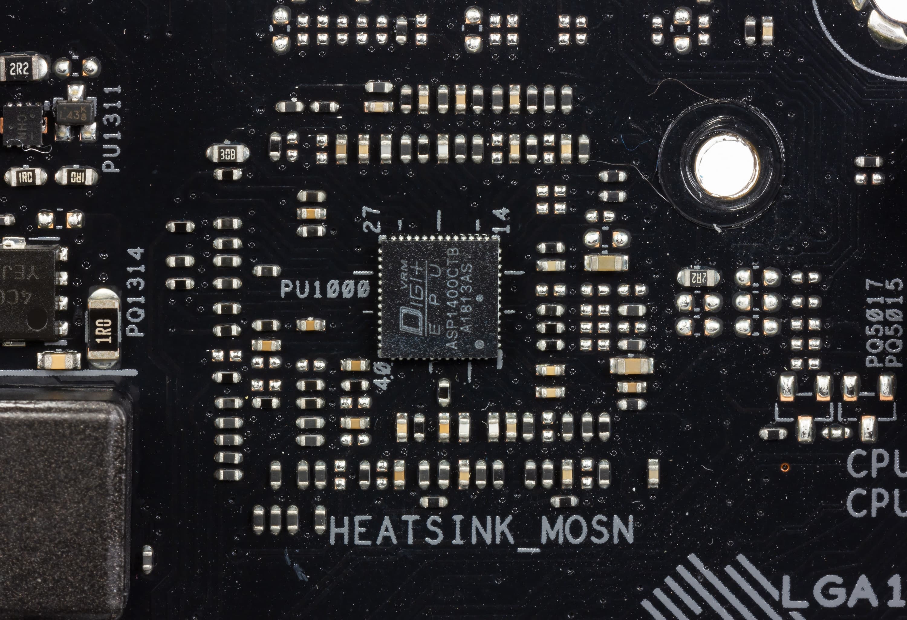 Управляет данной схемой цифровой контроллер Digi+ EPU ASP1400CTB (эти Digi+ традиционно входят в схемы Asus VRM, разумеется, это перемаркированные процессоры иных производителей, в данном случае есть предположение, что производитель — On Semiconductor). Он не способен управлять напрямую девятью фазами, поэтому реальное количество фаз — 4+1.