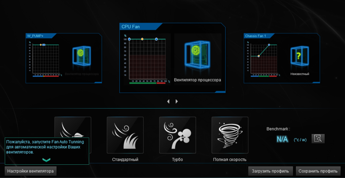 Закладка мониторинга просто демонстрирует температуры и частоты вращения вентиляторов, давая возможности управлять работой вентиляторов (также это делать можно через утилиту AI-Suite, о которой я ранее писал).