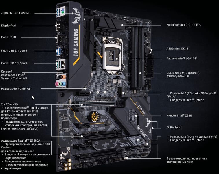 Поскольку жизнь у Z390 стала не только долгой, но и охватила уже огромный ценовой сегмент, на этом же продукте Intel основано и несколько материнских плат из серии TUF компании Asus. Напомню, что серия TUF — это геймерские продукты, однако где упор сделан не на достижение максимальных показателей производительности, включая оверклокерские «фишки», не на наличие эксклюзивных «фенечек», а просто, чтобы была стабильная и долговечная работа. Собственно, слово «TUF» обыгрывает по звучанию английское «tough» — прочный, выносливый, крепкий.
