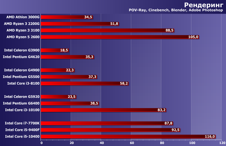 Равно как и без сравнения с процессорами AMD не обойтись, но тут «правильный» подбор моделей достаточно сложен. Поэтому мы просто волюнтаристски взяли четыре процессора. Athlon 3000G — как альтернативу Celeron. Ryzen 3 2200G — цена некоторых представителей семейства «Ryzen 3 на старых ядрах» на уровне младших Pentium, а производительность процессорной части у них у всех сопоставимая. Ryzen 3 3100 — прямой конкурент Core i3-10100. И... еще один прямой конкурент этому процессору по цене, но шестиядерный: Ryzen 5 2600. В принципе, там уже и до Ryzen 5 3600 недалеко, благо в последнее время сильно подешевел (особенно благодаря ситуации с видеокартами), но его добавлять не интересно — и без того ясно, что самый быстрый (даже i5-10400 все равно медленнее). Главная тема — бюджетный сегмент, а тут у AMD нового ничего и не было с середины прошлого года, да и тогда ассортимент пополнили парой моделей (потом еще вышло несколько интересных APU, но их доступность ограниченная). В основном приходится «отдуваться» старым микроархитектурам, но смотреть на них в исполнении 4С/8Т уже надоело.