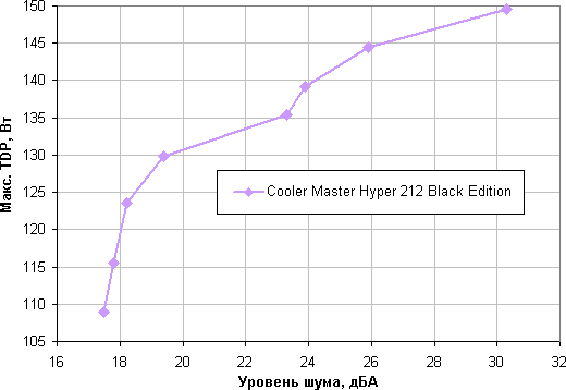 Приняв 25 дБА за критерий условной бесшумности, получим, что примерная максимальная мощность процессора, соответствующего этому уровню, составляет порядка 140 Вт. Для относительно небольшого воздушного кулера с одним вентилятором это хороший результат. Еще раз уточним, это в жестких условиях обдува радиатора нагретым до 44 градусов воздухом, при снижении температуры воздуха указанные пределы мощности для бесшумной работы и максимальной мощности возрастают. Гипотетически, если не обращать внимания на уровень шума, предел мощности можно увеличить где-то до 150 Вт.