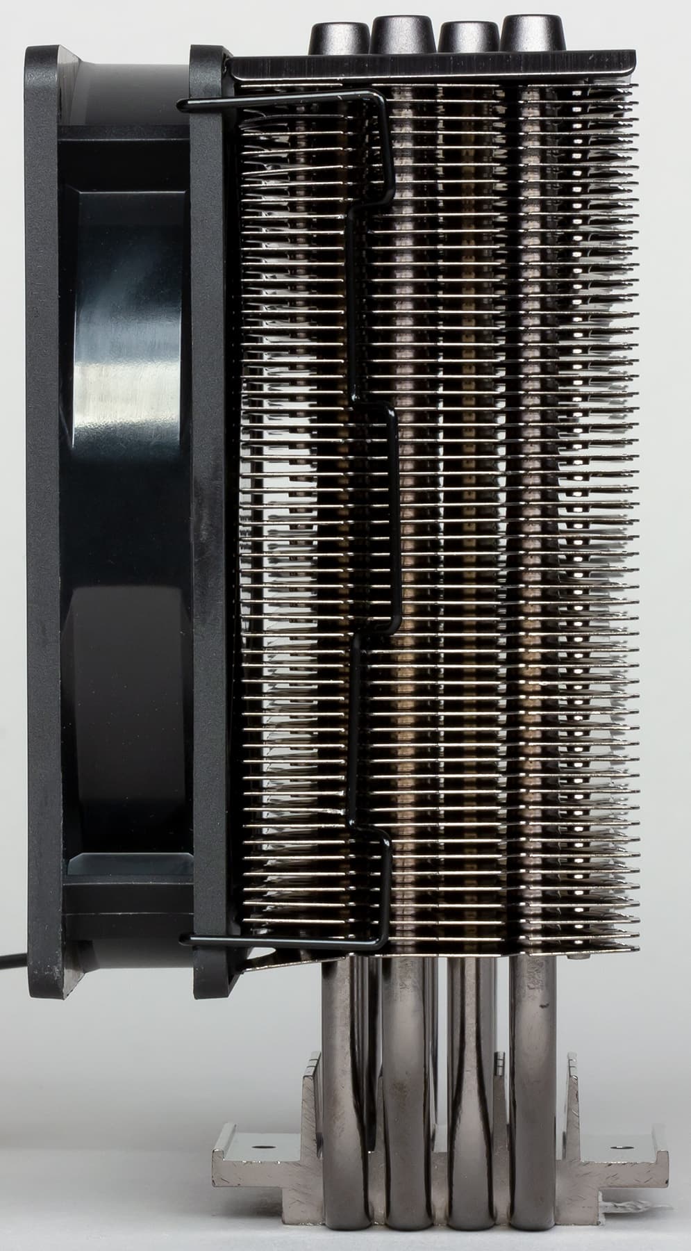 Кулер оснащен вынесенным радиатором, к которому тепло от процессора передается по четырем тепловым трубкам. Трубки, разумеется, медные. У основания теплосъемника трубки сплющены и впрессованы в канавки. Теплосъемник изготовлен из алюминия. Ребра сверху на теплосъемнике в какой-то степени улучшают производительность кулера.