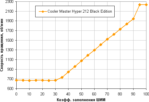Диапазон регулировки не очень широкий от 30% до 95% с плавным и практически линейным ростом скорости вращения на большей части зависимости. При снижении коэффициента заполнения (КЗ) до 0 вентилятор не останавливается. Это может иметь значение, если пользователь хочет создать гибридную систему охлаждения, которая при низкой нагрузке работает полностью или частично в пассивном режиме.