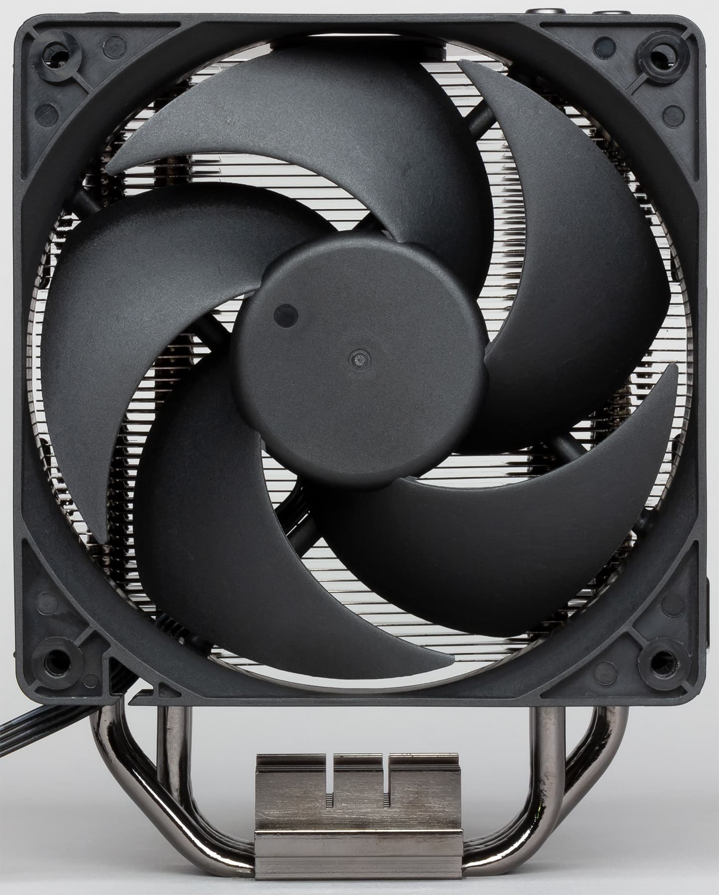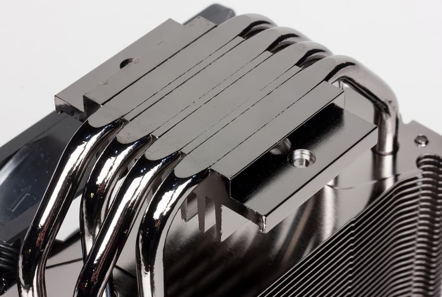 Сверху на кулере закреплена алюминиевая пластина толщиной 1 мм, в центральный вырез которой вставлен рельефный металлический логотип производителя. Из отверстий в этой пластине выглядывают алюминиевые колпачки, прикрывающие торцы тепловых трубок. Пластина и колпачки анодированы и выкрашены в черный цвет. Остальные металлические детали радиатора — основание, трубки и ребра — имеют стойкое гальваническое покрытие (никелированы) темного, почти черного цвета. Как утверждает производитель, темный цвет улучшает охлаждение радиатора за счет излучения.