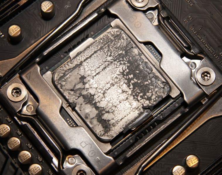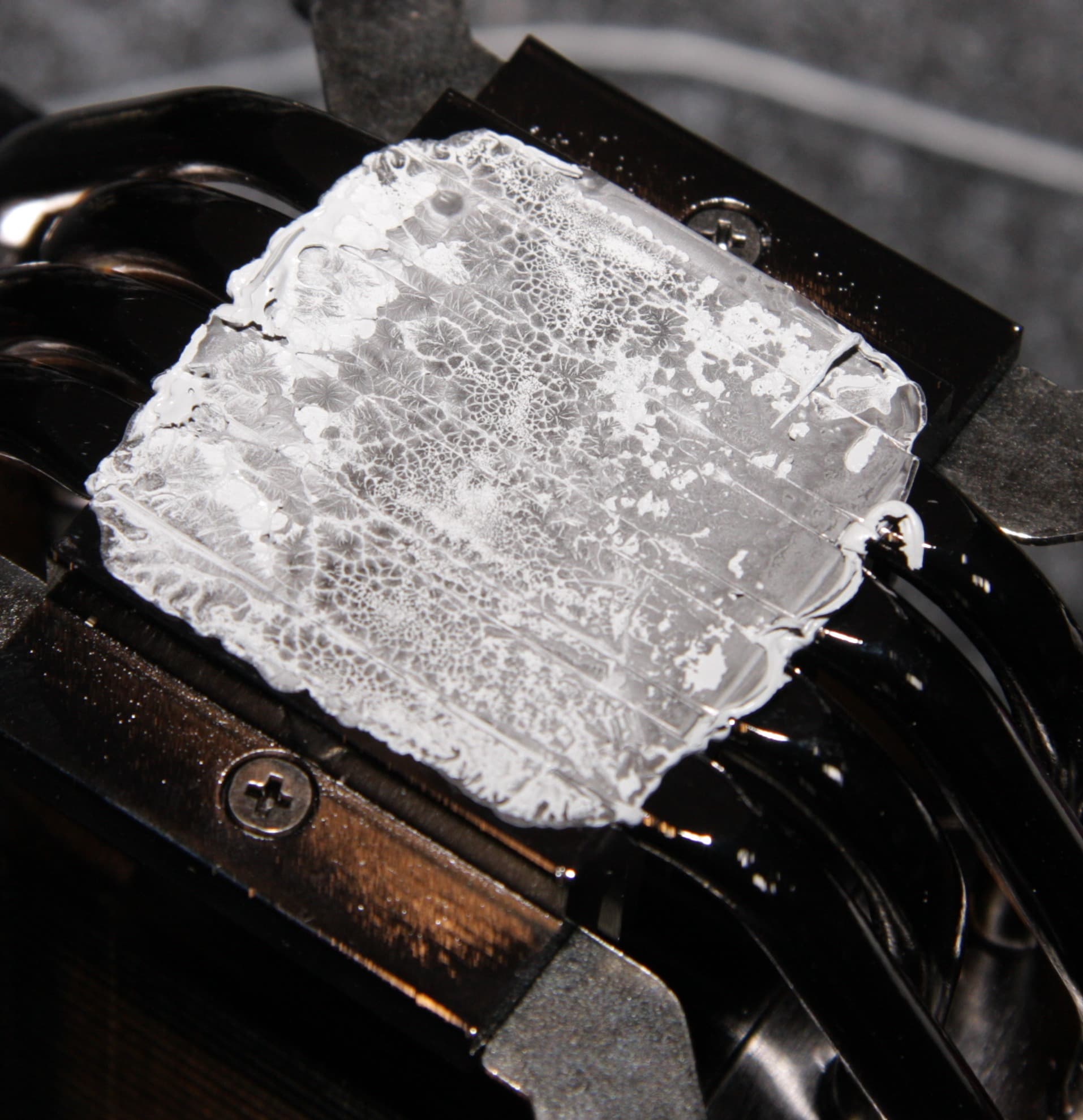 Видно, что термопаста распределилась очень тонким почти по всей плоскости крышки процессора, а ее избыток выдавился по краям. Очевидно, что в данном случае с термопастой сложно переборщить, так как ее избытки выдавливаются за плоскость подошвы. Отметим, что свежая и после тестов данная термопаста относительно жидкая, липкая и чуть тягучая, она выдавливается гораздо легче, чем счищается.