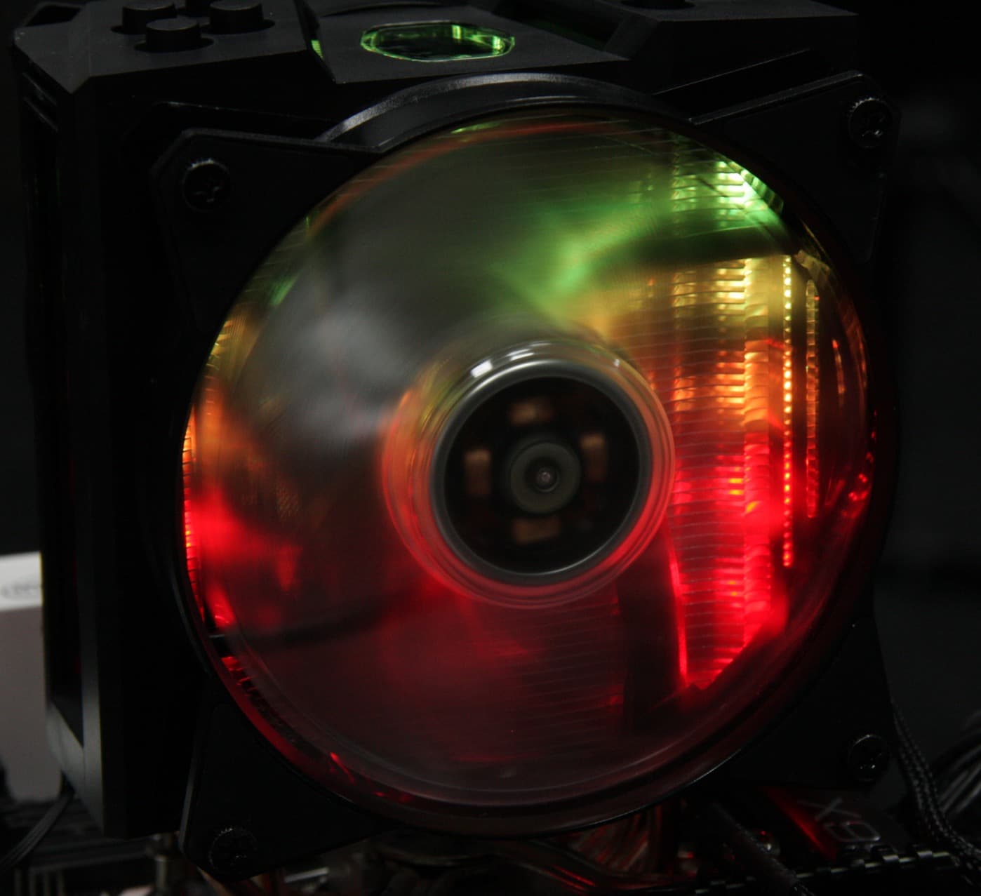 Режимов с зависимостью от температуры два, в обоих цвет меняется от синего до красного через другие цвета, но чем выше расположен светодиод на радиаторе кулера, тем выше температурная граница перехода от одного цвета к другому. В одном режиме подсветка статичная, во втором — снизу вверх пробегает волна выключения. Например так выглядит кулер в случае статичного варианта и при нагреве процессора до 91 °C по данным его термодатчика: