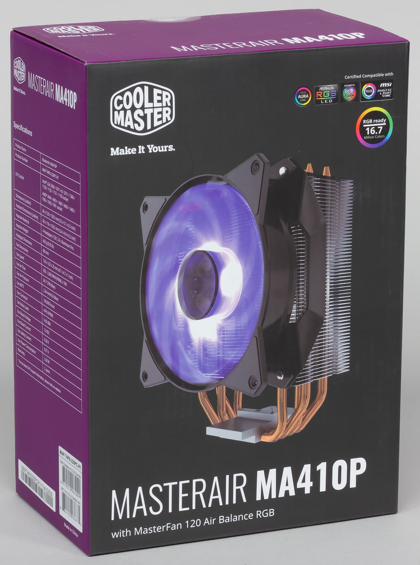 Поставляется процессорный охладитель Cooler Master MasterAir MA410P в красочно оформленной коробке из тонкого гофрированного картона.